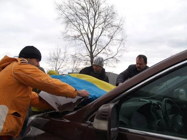 Активисты украсили авто сине-желтыми флагами, чтобы красиво заехать в город.
