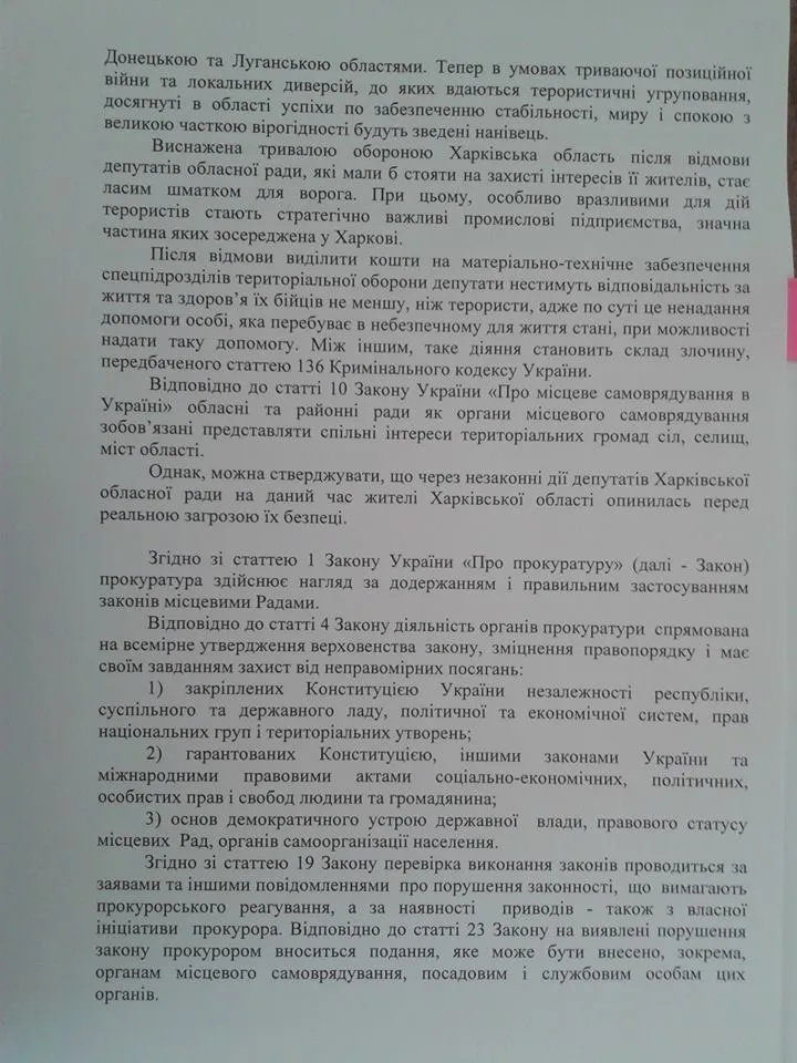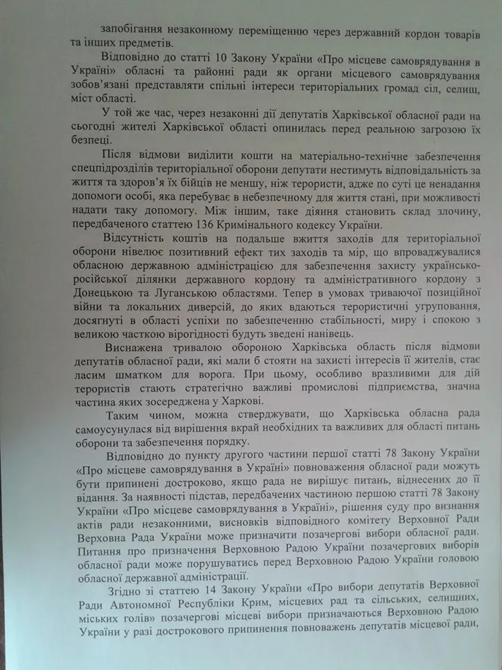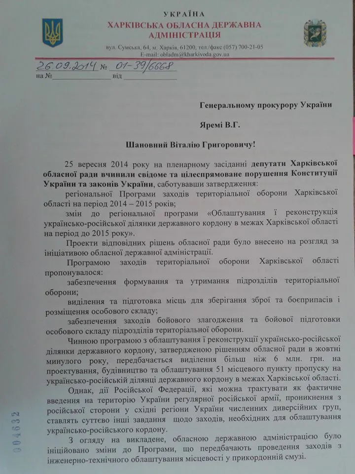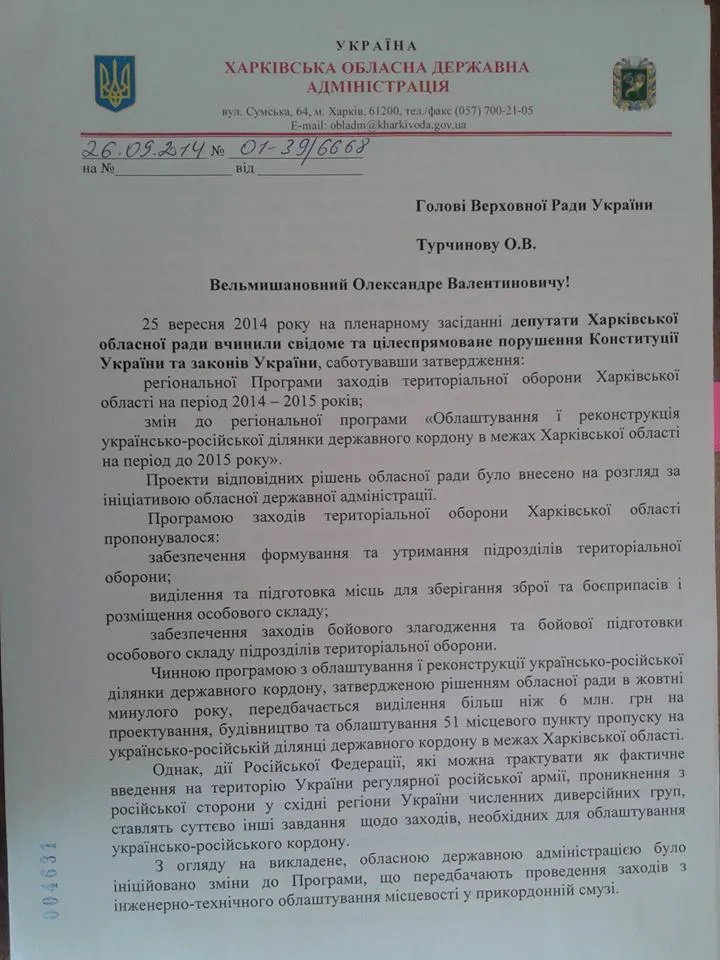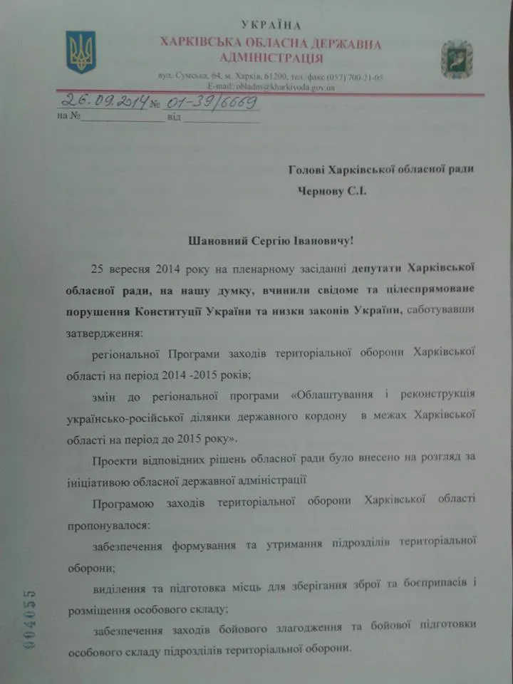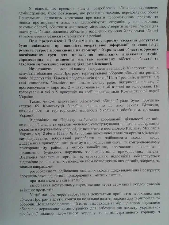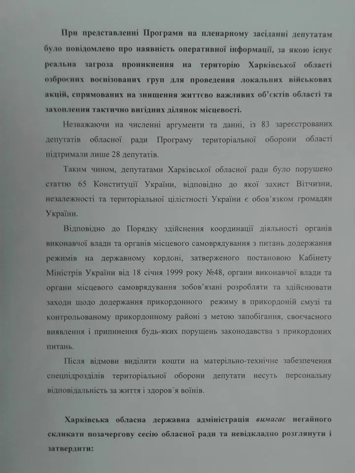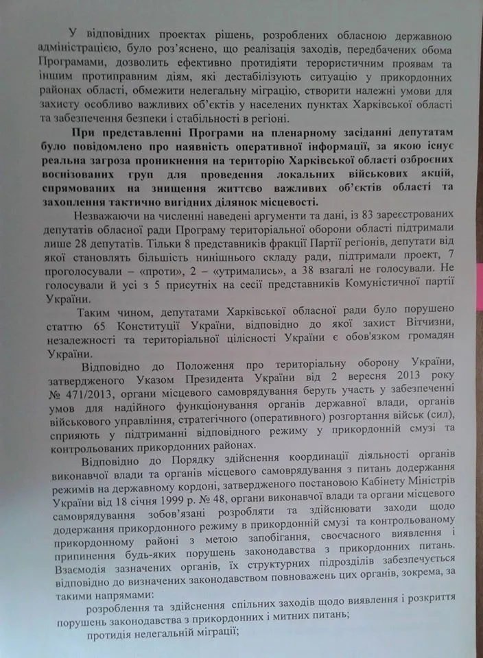 Глава Харьковской ОГА подчеркнул, что депутаты "совершили сознательное и целенаправленное нарушение Конституции и Законов Украины, саботировав утверждение" программы мероприятий территориальной обороны Харьковской области на период 2014-2015 годов и изменения к региональной программе "Обустройство и реконструкция украино-российского участка государственной границы в пределах Харьковской области на период до 2015 года”.