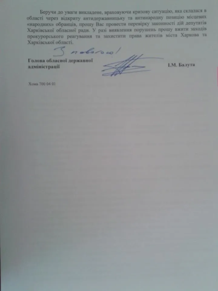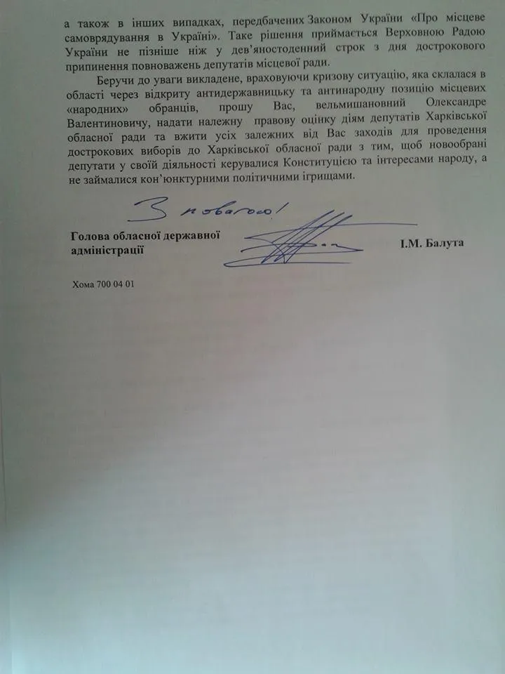 Принимая во внимание изложенное, учитывая кризисную ситуацию, сложившуюся в области из-за открытой антигосударственной и антинародной позиции местных "народных" избранников, прошу Вас, глубокоуважаемый Александр Валентинович, дать надлежащую оценку действиям Харьковского областного совета и принять все зависящие от Вас меры для проведения досрочных выборов в харьковский областной совет для того, чтобы новоизбранные депутаты в своей деятельности руководствовались Конституцией и интересами народа, а не занимались конъюнктурными политическими играми,