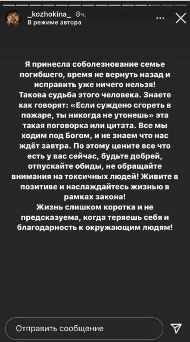 "Я принесла соболезнования семье погибшего, время не повернуть назад и исправить уже ничего нельзя. Такова судьба этого человека", – резюмировала девушка.