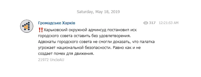 Телеграмм канал "Общественное. Харьков" сообщил о том, что адвокаты не смогли доказать тот факт, что палатка угрожает национальной безопасности и создает препятствия для дорожного движения.