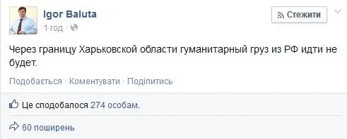 "Через границу Харьковской области гуманитарный груз с РФ не будет идти", - написал Балута в Facebook.