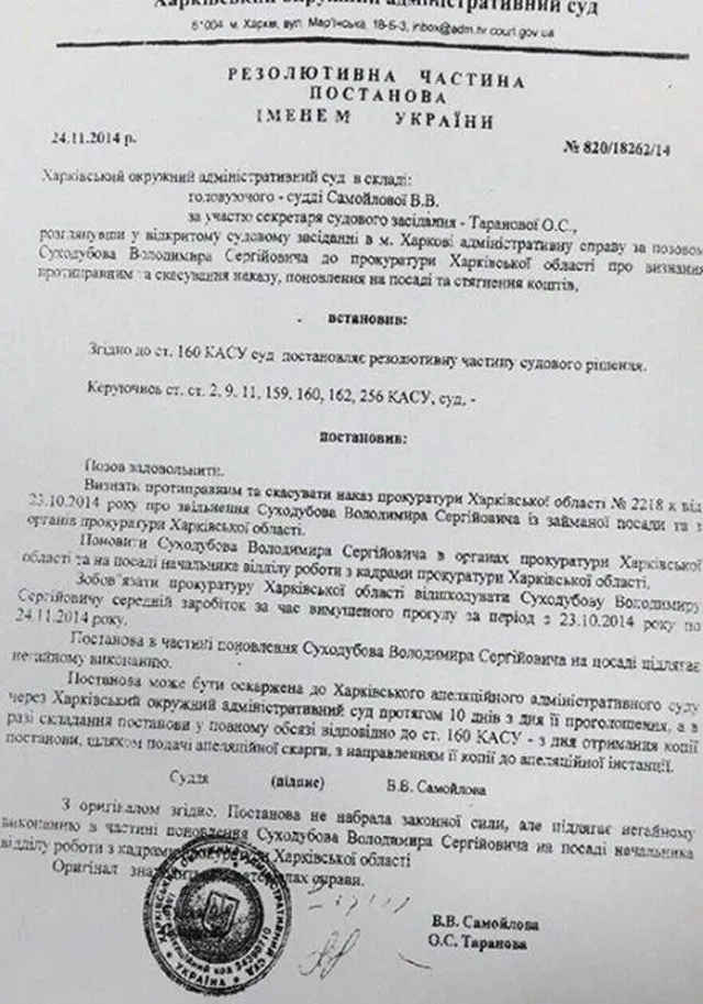 Своим решением суд обязал немедленно восстановить Владимира Суходубова в должности начальника отдела по работе с кадрами прокуратуры Харьковской области.