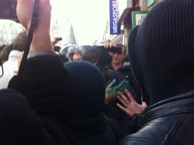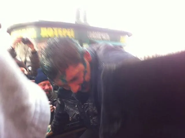 Згодом депутата вивели з аптеки, попутно обливши зеленкою і кинувши кілька яєць.
