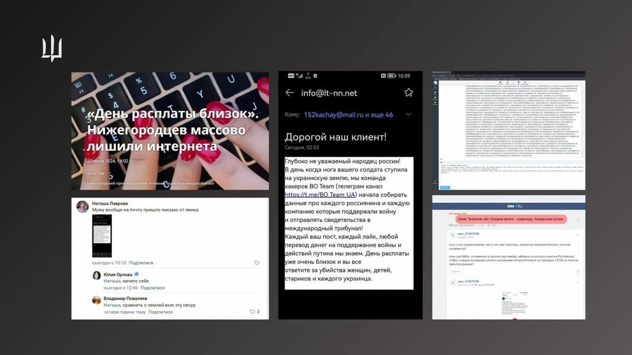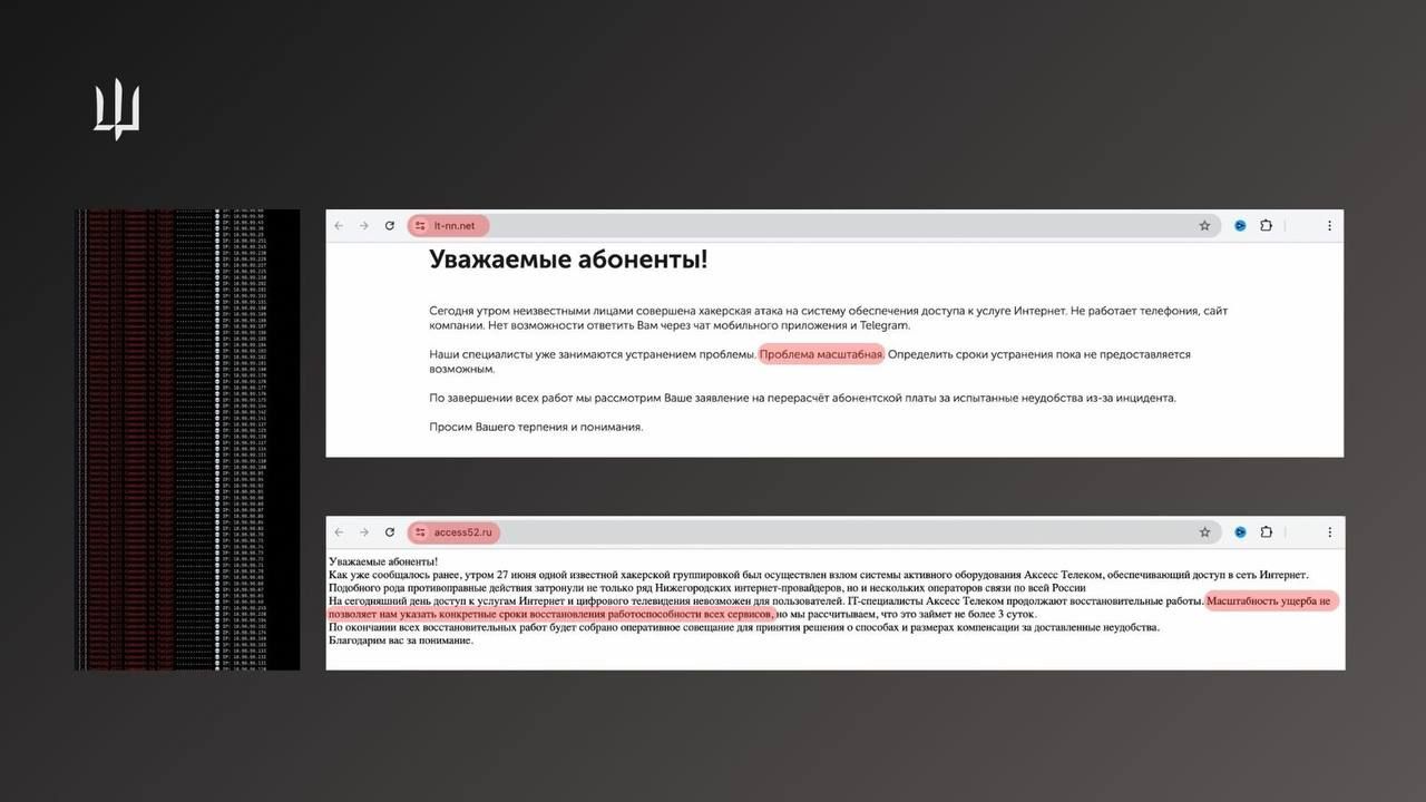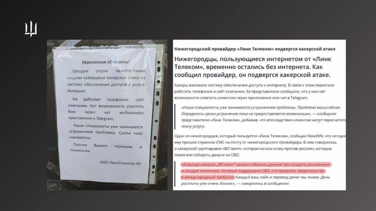 - усі дані на 19 серверах інтернет-провайдерів у місті Нижній Новгород – "Линктелеком НН" і "Аксесс Телеком". Усім абонентам вказаних провайдерів надійшли листи з нагадуванням про неминучу розплату за війну проти України.