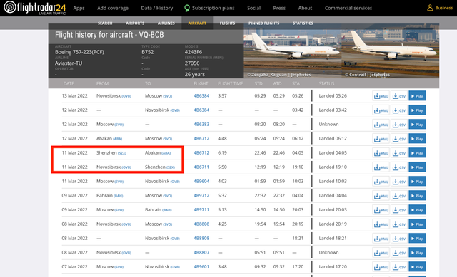 Дані публічних онлайн-радарів свідчать, що всі 5 вкрадених та перереєстрованих Росією літаків регулярно та безперешкодно літають у Китай. Загалом таких перельотів з початку війни було здійснено понад 20. Крім того, ці ж літаки декілька разів літали до Єгипту та Бахрейну.
