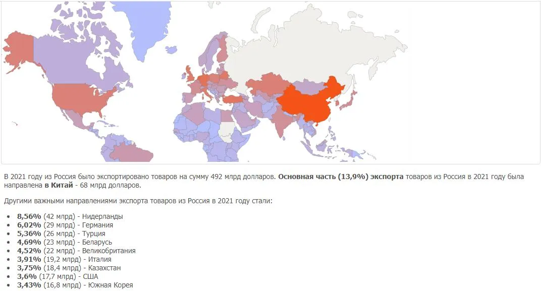 Натомість у 2021-му, коли Путін вже відкрив для своєї країни "колосальні нові можливості" Сходу, експорт країни-терористки складав вже 492 мільйони у.о. При цьому перелік найбільших покупців товарів Москви не так щоб сильно змінився: