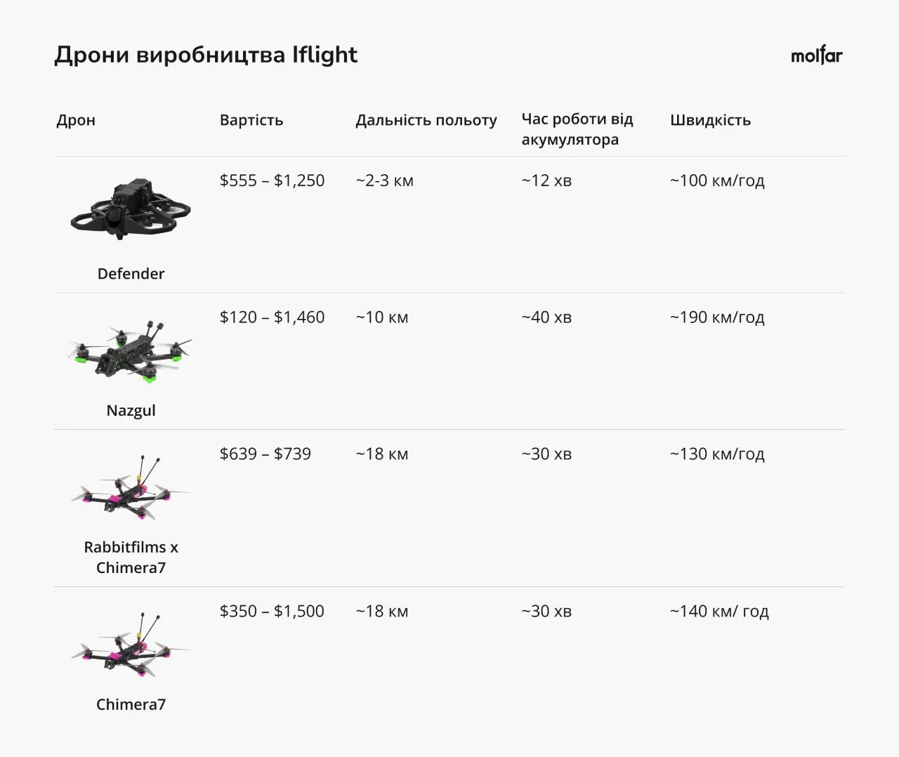 iFlight Technology Company Limited — це компанія, що займається виготовленням дронів, такіих як Defender, Nazgul, Chimera7, Taurus і Rabbitfilms. Також компанія продає запчастини та комплектувальні елементи: джойстики, окуляри для управління дронами, зарядні пристрої і батареї та інші деталі. До того ж Iflight — ключовий гравець у сфері безпілотних літальних апаратів, і повністю (1, 2) володіє іншим відомим виробником безпілотників — DJI. Вони ж своєю чергою виробляють і знамениті дрони Mavic. Цих виробників можна назвати одними із лідерів у виробництві FPV та комплектувальних елементів до них.