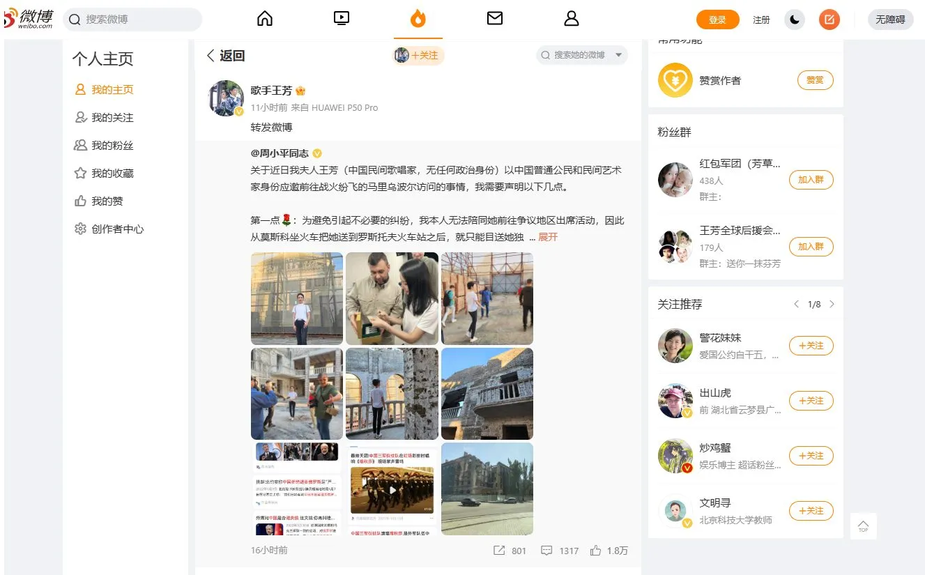 Чоловік опублікував допис у соцмережі Вейбо. Там він прокоментував поїздку дружини на тимчасово окуповану територію України та її виступ "на кістках" цивільного населення, яке знищили російські окупанти.
