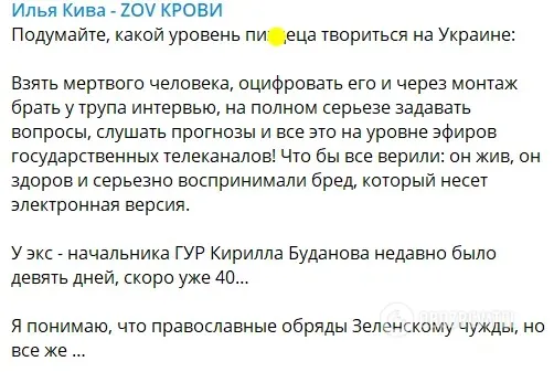 Якщо що, то мантру про "мертвого" Буданова Кива носить з собою вже понад тиждень. Він вигадував про якесь там "поранення" глави ГУР МО, а також його лікування у Німеччині.