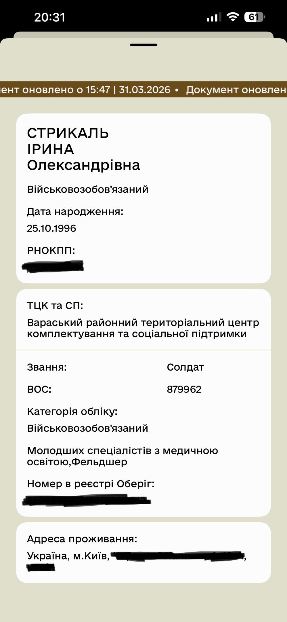 За її словами, вона має прописку у місті Київ, а також освіту за спеціальністю "менеджмент". Та попри це жінку поставили на облік у ТЦК Вараського району на Рівненщині, надавши звання солдат та спеціальність фельдшер.