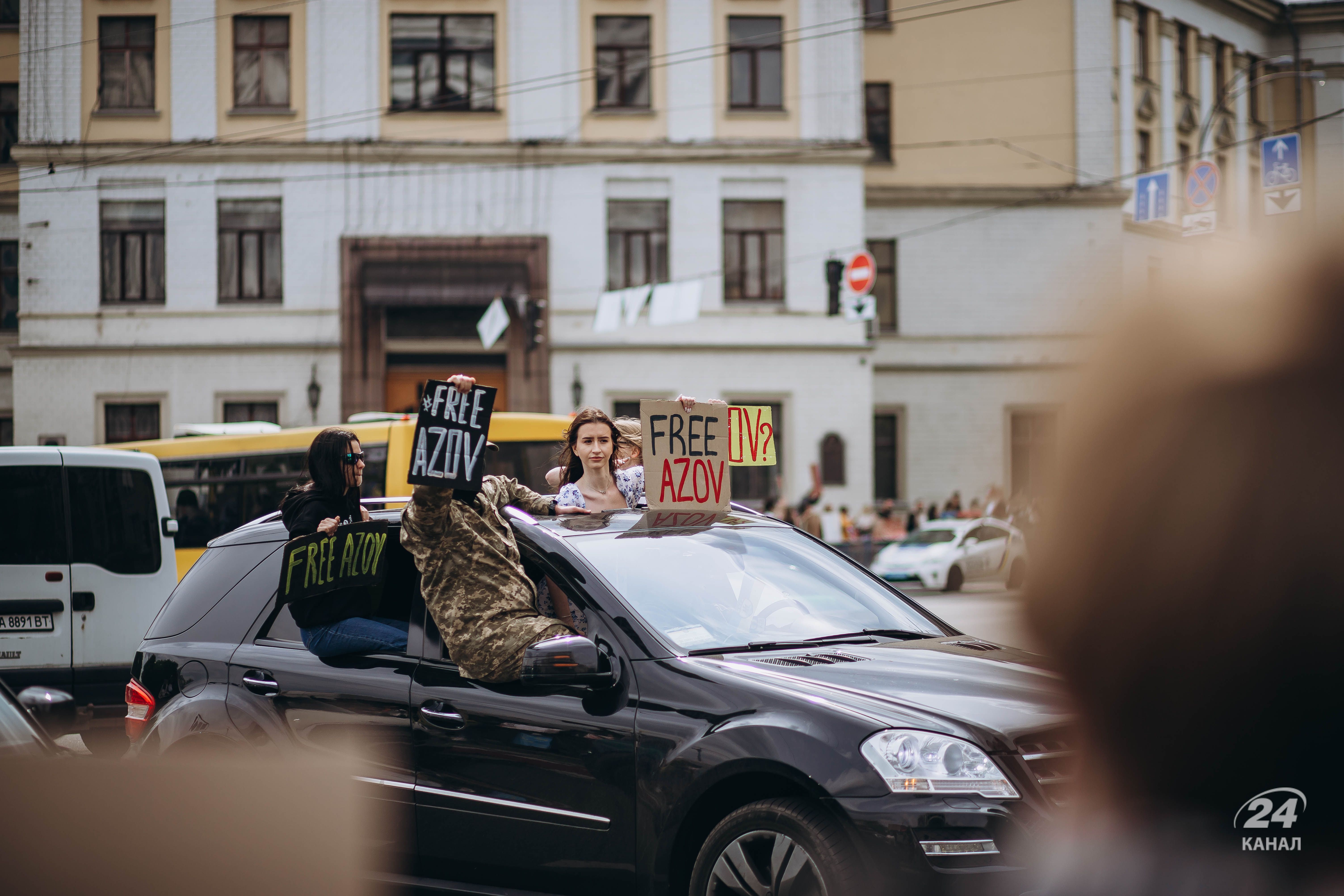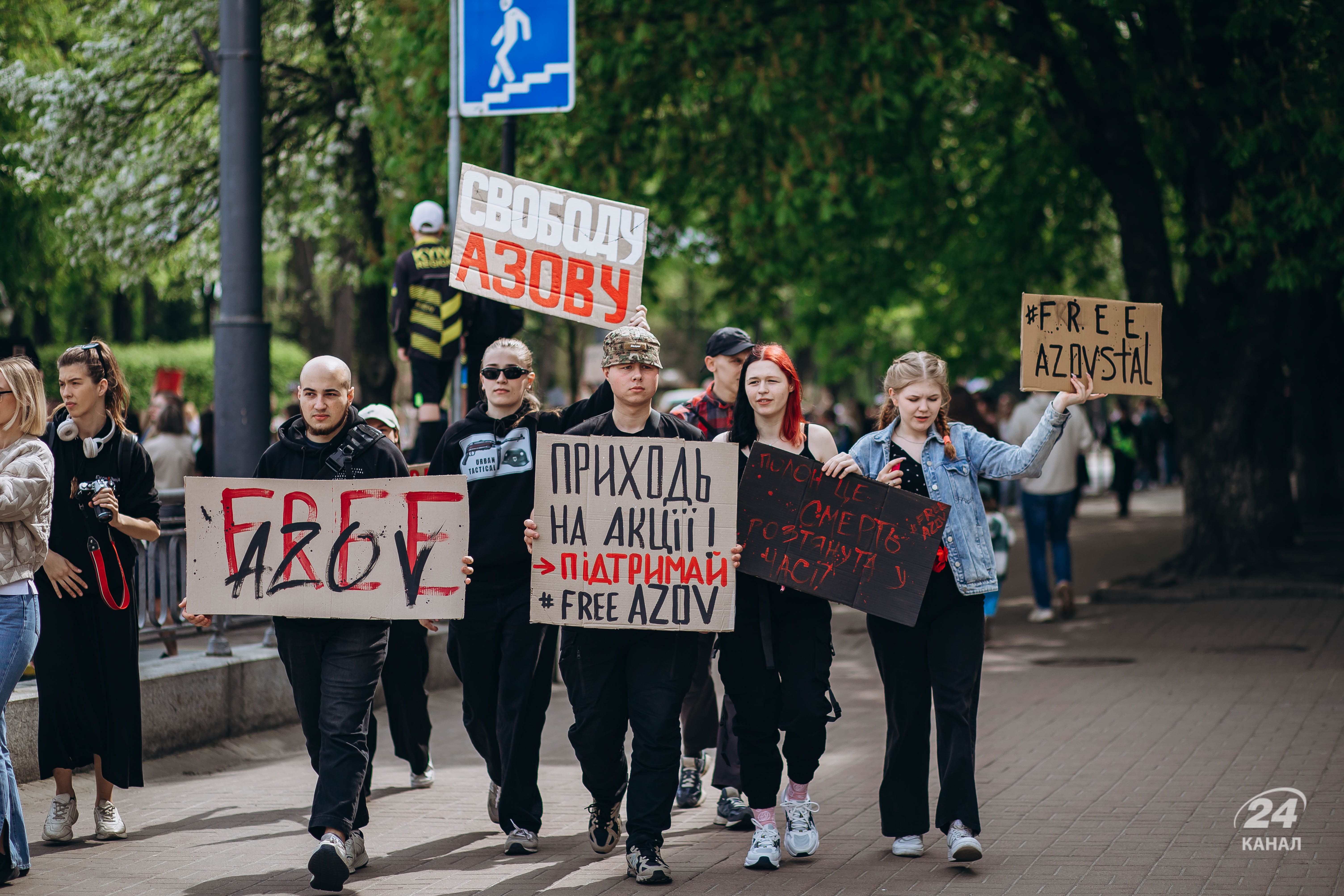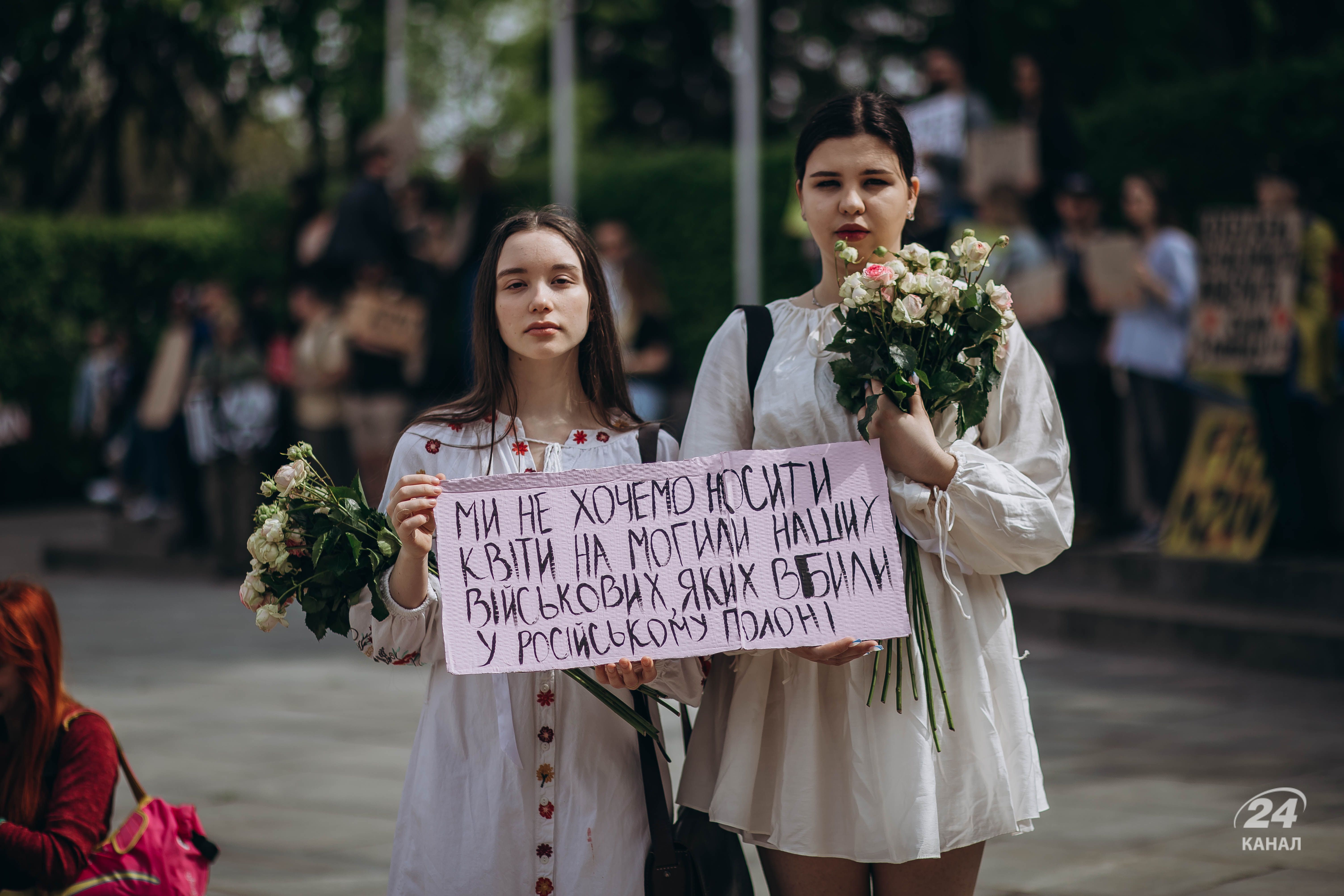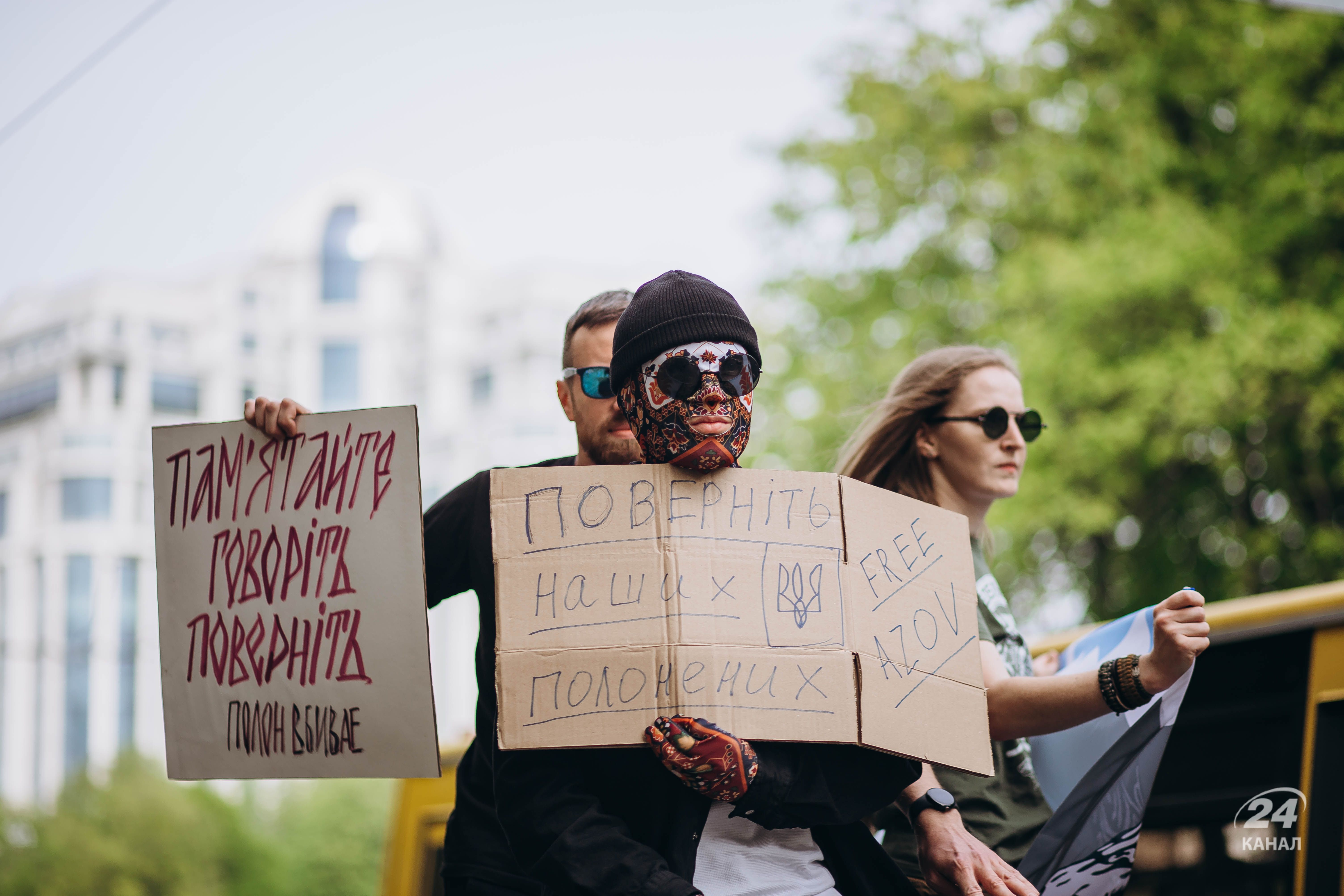 Люди тримали плакати з надписами "Твоя мовчанка може стати ганьбою", "Їх чекають вдома", "будь голосом полонених!", "Поверніть захисників Маріуполя – живих та полеглих" тощо.