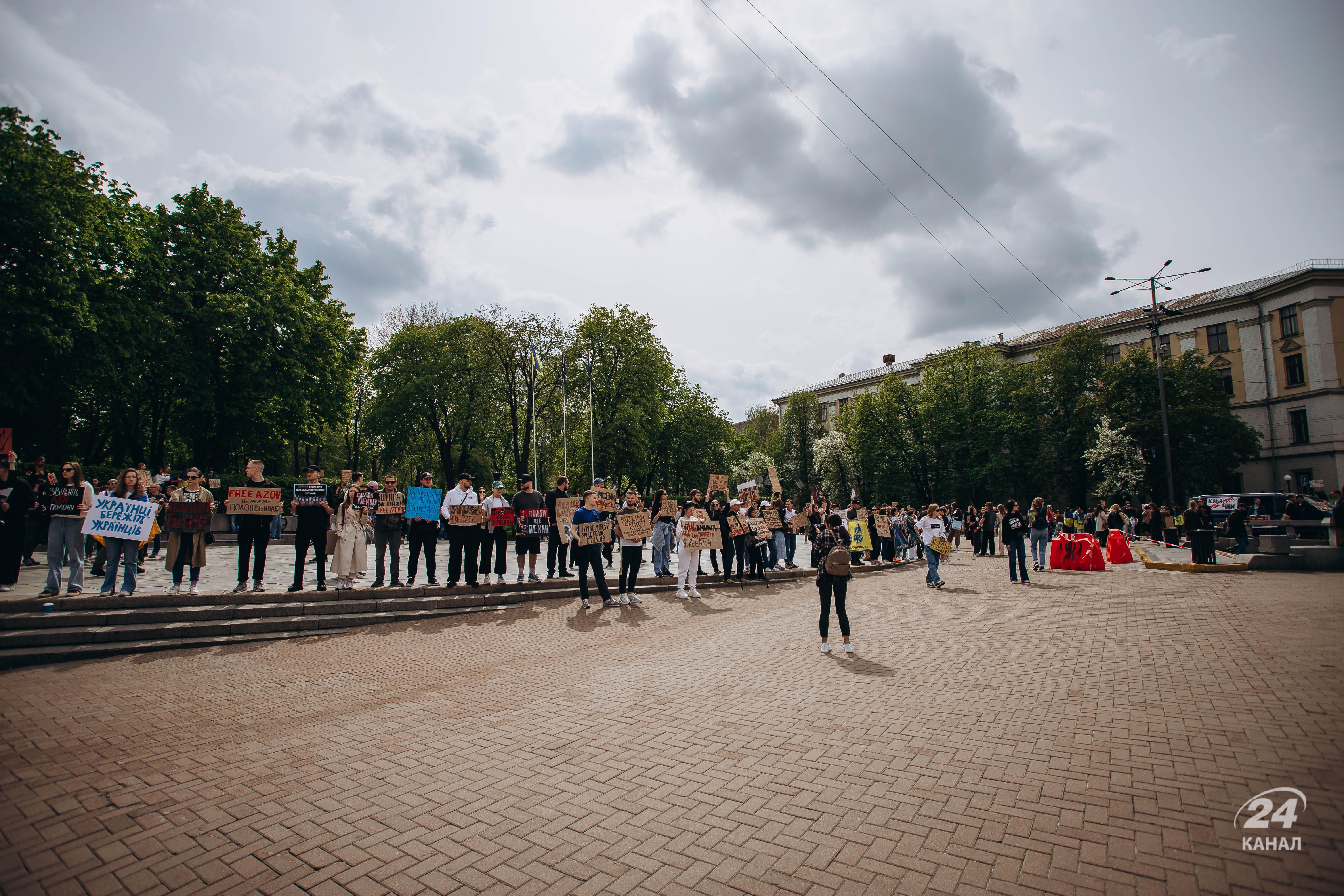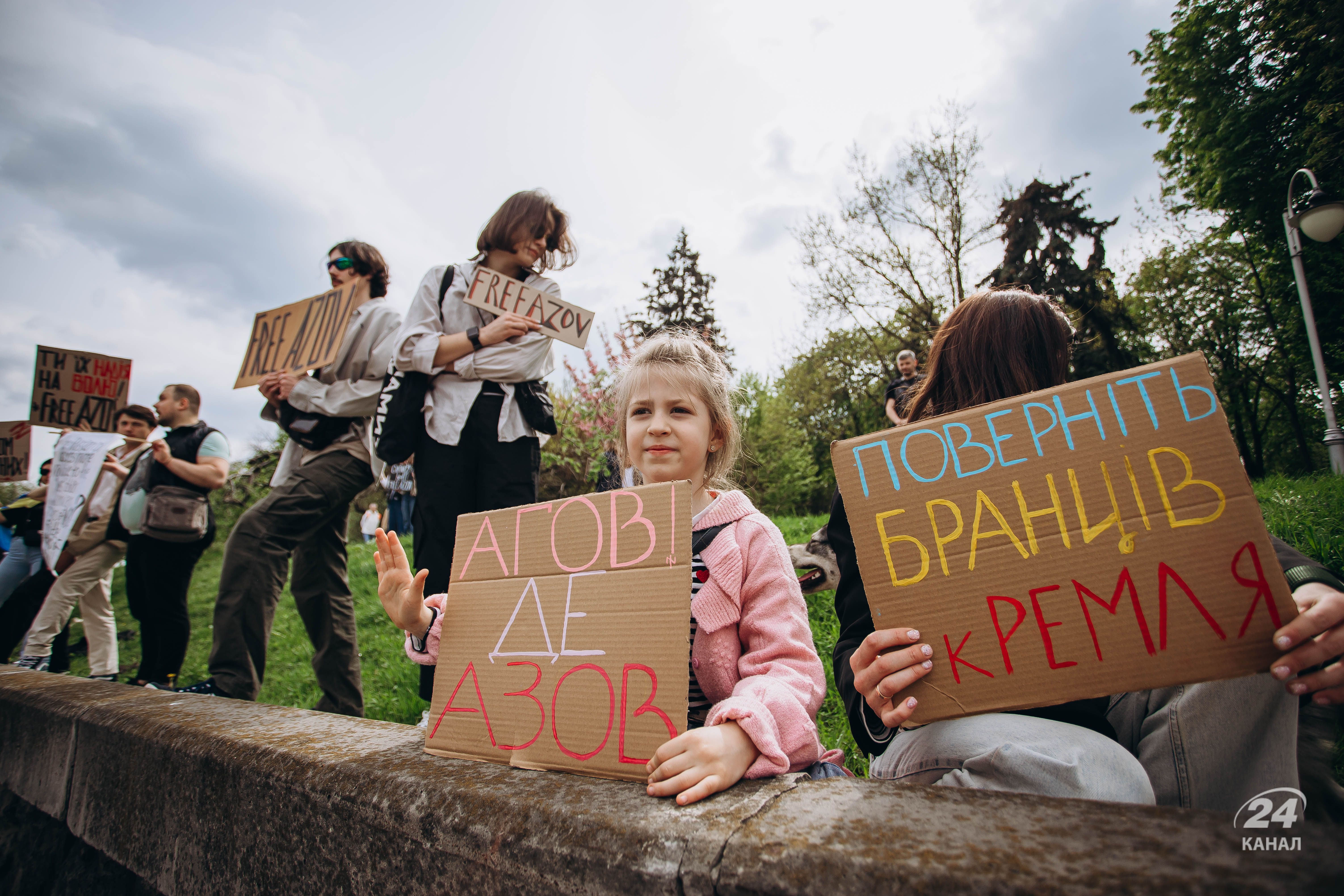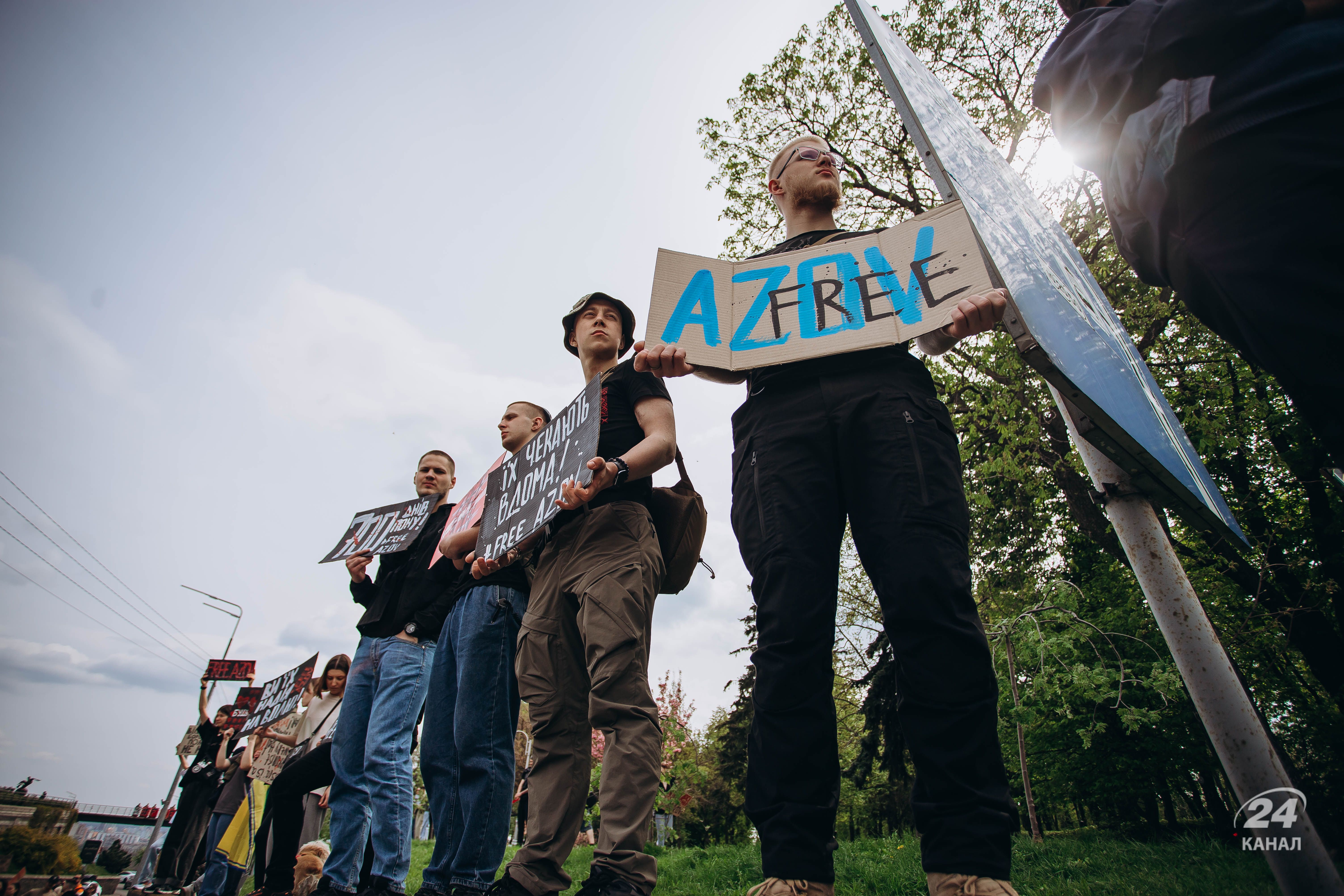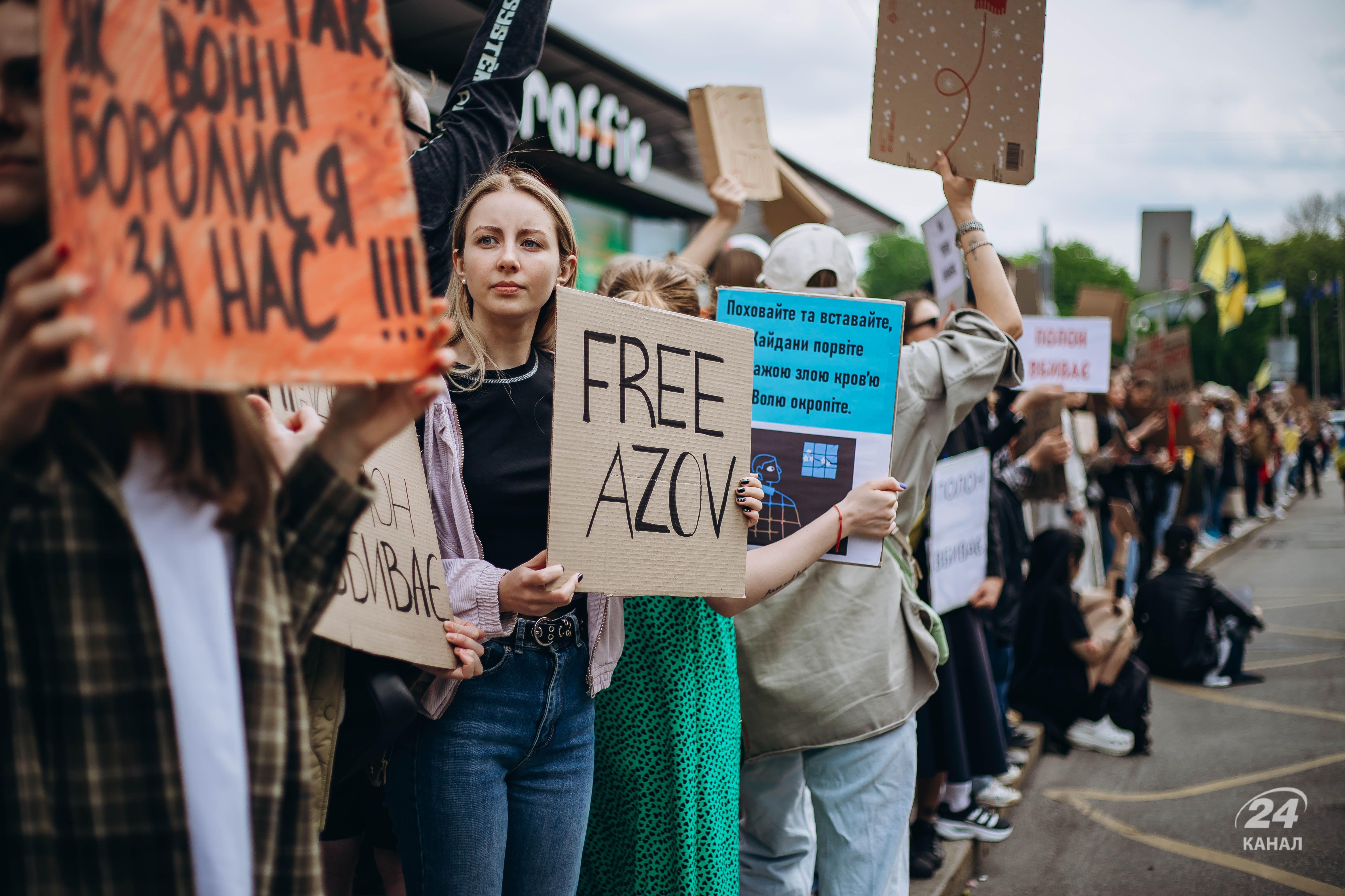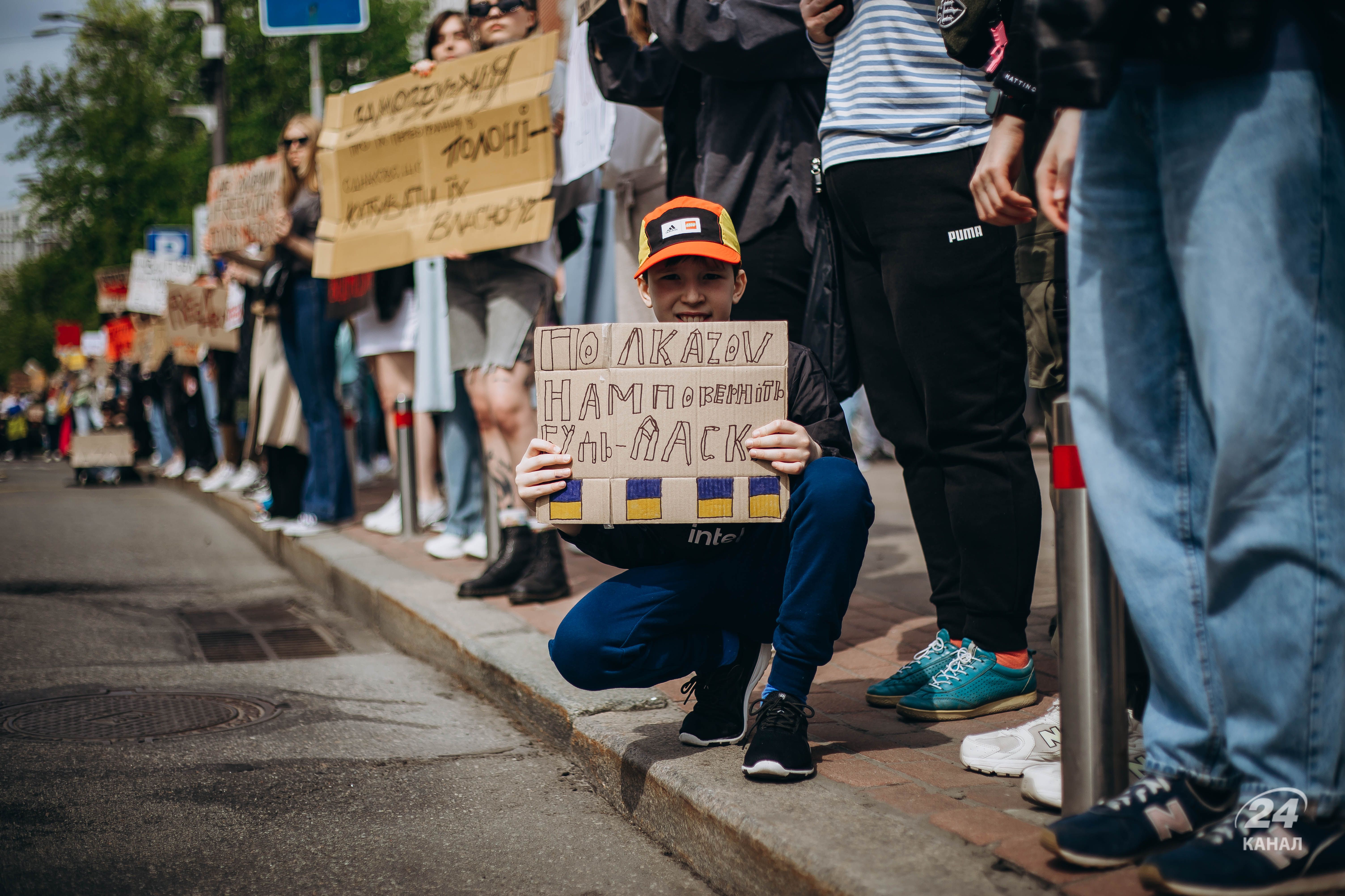 Люди тримали плакати з надписами "Твоя мовчанка може стати ганьбою", "Їх чекають вдома", "будь голосом полонених!", "Поверніть захисників Маріуполя – живих та полеглих" тощо.