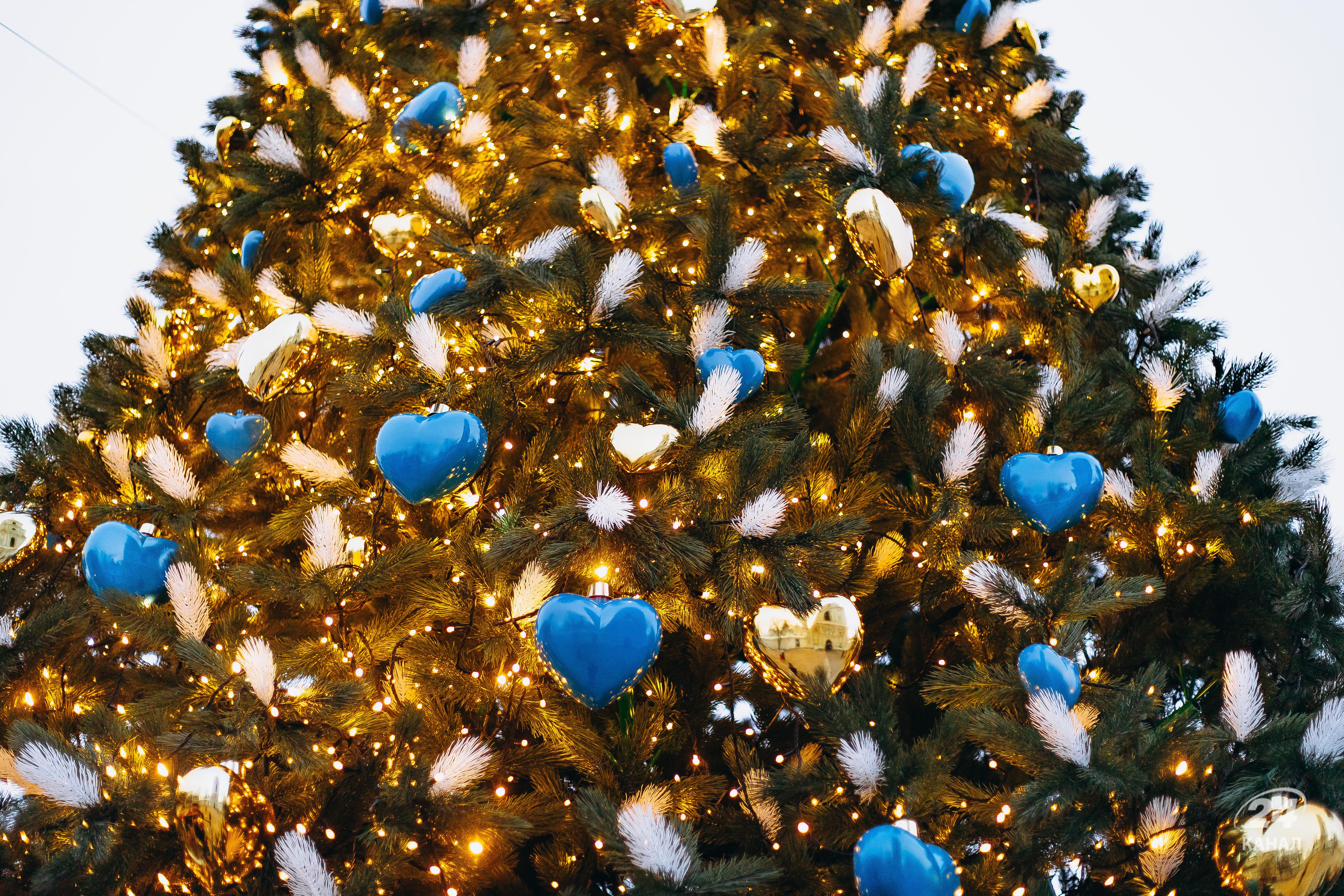На дереві можна помітити золоті, сині та білі прикраси і багато гірлянд, які світяться приємним жовтим світлом. Вінчає ялинку тризуб.