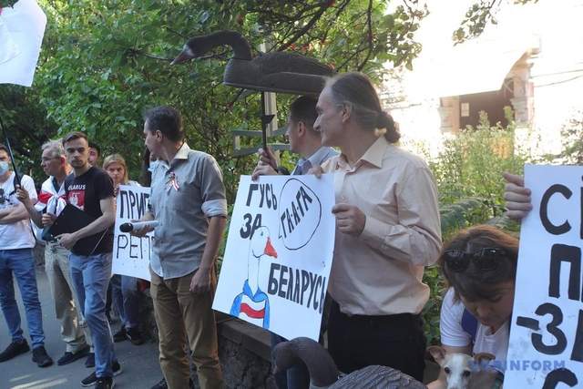 Під білоруським посольством з'явились не лише різноманітні скульптури гусаків, а й традиційні символи протесту – біло-червоно-білі стяги, а також плакати. На них – заклики припинити переслідування та негайно звільнити усіх політв'язнів.