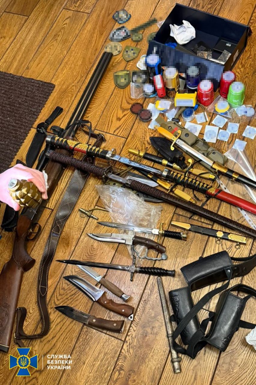 Під час обшуків правоохоронці вилучили телефони, ноутбуки, підроблені штампи та печатки та різні види зброї. Також СБУ вилучила понад 100 фейкових посвідчень, довідки та проросійські агітаційні листівки.
