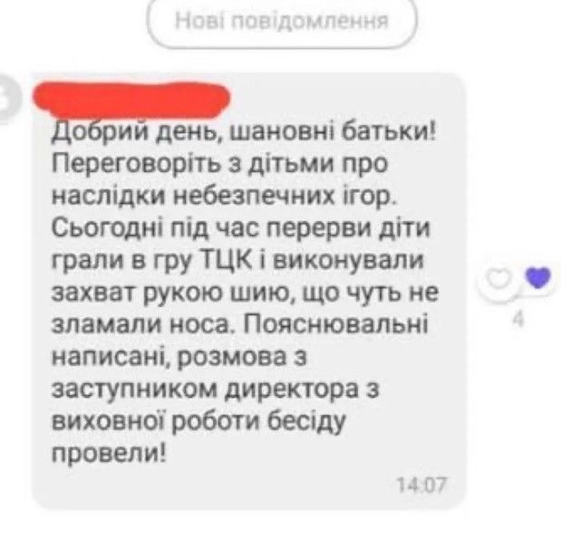 Сьогодні під час перерви діти грали в гру "ТЦК" та виконували захват рукою шиї, що ледве не зламали носа. Пояснювальні написані, розмову з заступником директора з виховної роботи провели!