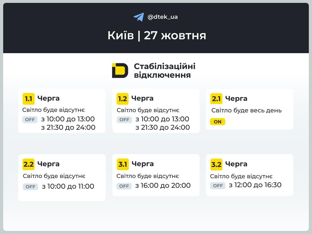 Користувачі можуть знайти оновлені графіки відключень на 27 жовтня. У разі змін ДТЕК одразу буде повідомляти про них.