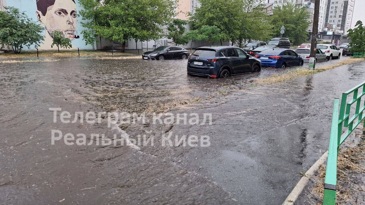 У Києві внаслідок зливи подекуди вода підтопила дороги та тротуари. На опублікованих кадрах видно, як машини їздять фактично на декілька сантиметрів у воді.