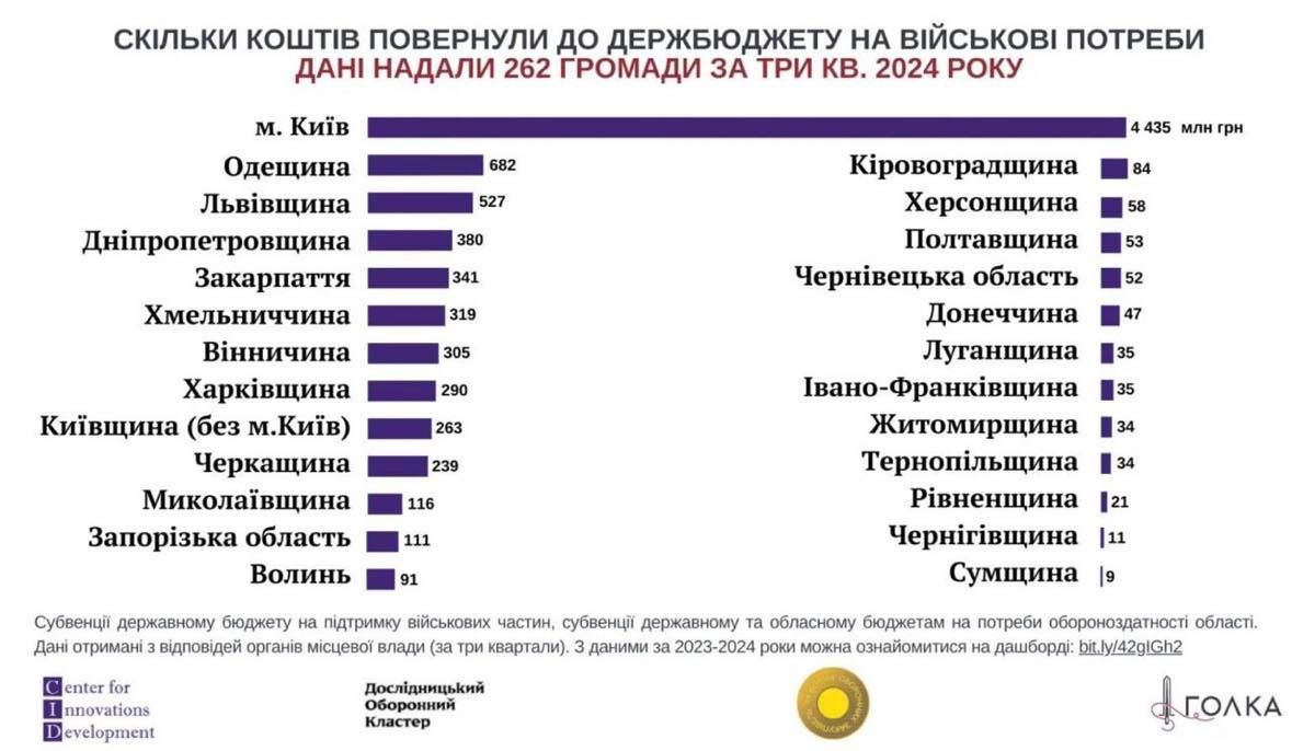 Якщо проаналізувати суми, що їх громади повернули з місцевого бюджету у вигляді субвенцій на підтримку сил оборони саме до державного бюджету для подальшого розподілу, то рейтинг очолює Київ. Зі столичного бюджету до державного, згідно з планами міста, мало надійти за минулий рік понад 4,4 мільярда гривень,