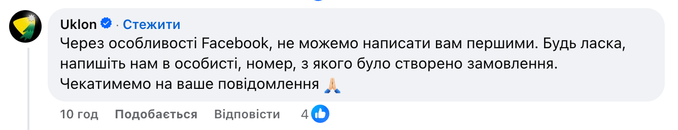 Згодом у коментарях під дописом компанія Uklon спробувала зв'язатися з Оленою Петрів, щоб уточнити деталі.