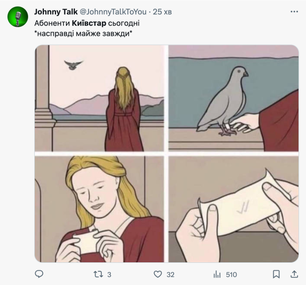Поки офіційної інформації про відновлення роботи мережі Київстар немає, користувачі соцмереж не втрачають енергії й придумали спосіб відправлення повідомлень. Абонентам Київстар пропонують скористатися голубиною поштою.