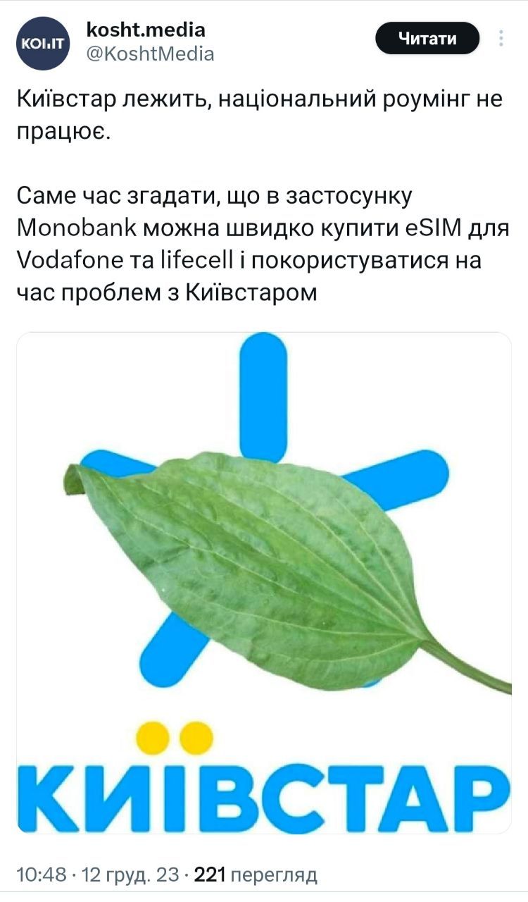 Українці точно знають, що неприємності бояться жартів. Тема, яка сьогодні, 12 грудня, залишається у топі обговорення – відсутність зв'язку в абонентів мережі Київстар – викликала хвилю жартів у мережі, пише 24 Канал.