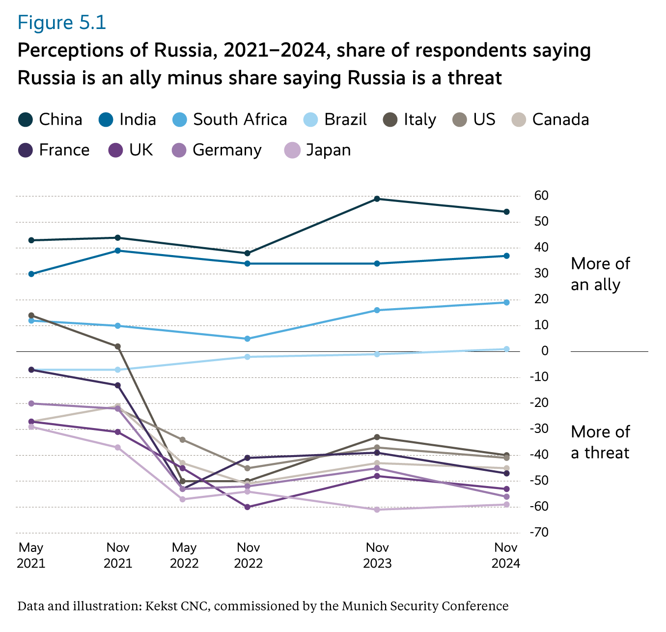 Інвестуючи в такі формати, як БРІКС, і переорієнтовуючи торгівлю на нових партнерів, як-от Китай, Росія запобігла дипломатичній та економічній ізоляції. Дійсно, багато людей в інших країнах БРІКС все ще позитивно ставляться до Росії, незважаючи на війну. Попри її обмежені можливості в багатьох сферах, Росія все ще широко сприймається як велика держава в країнах, які брали участь в опитуванні Мюнхенського індексу безпеки.