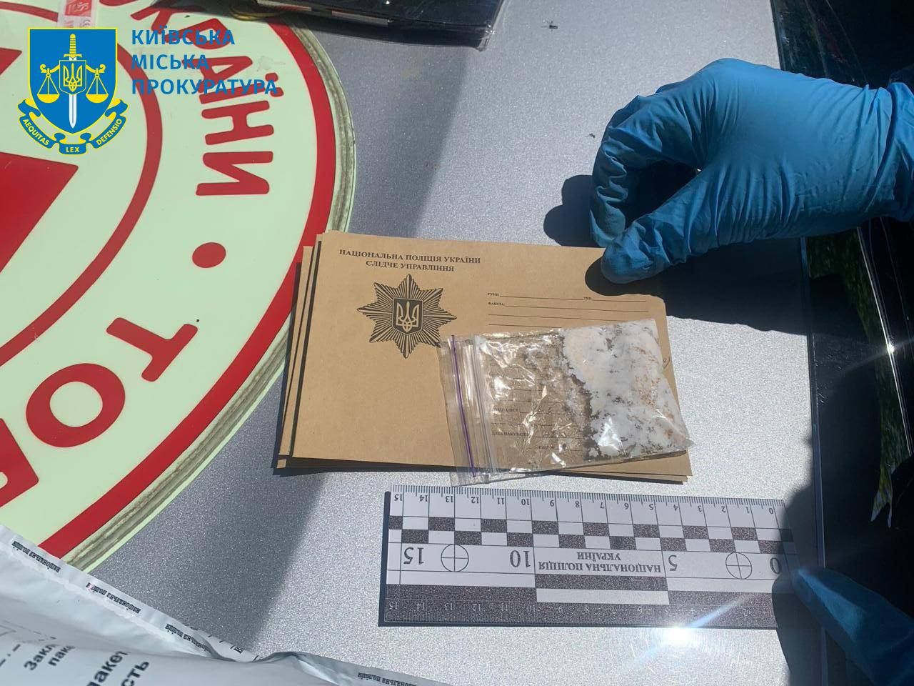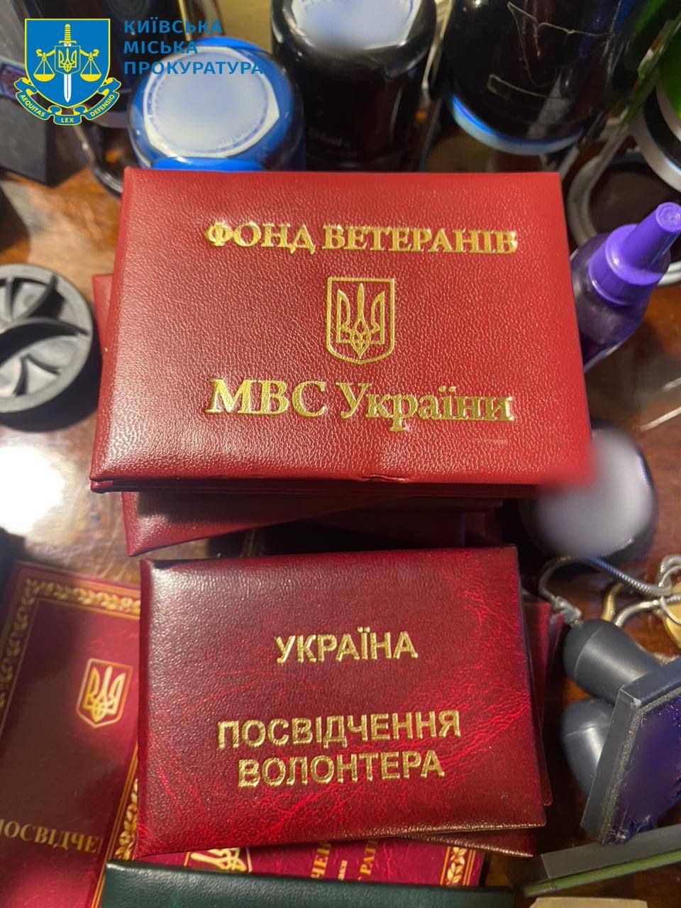 У колишнього волонтера під час обшуку вилучено, документи, які підтверджують незаконну видачу понад 300 підроблених посвідчень працівників-волонтерів Печерської районної організації Червоного Хреста, підроблені посвідчення волонтерів, а також амфетамін,