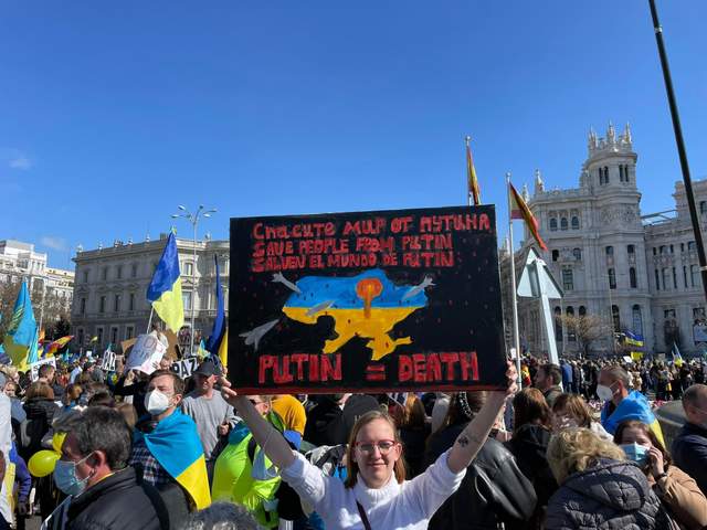 В іспанському місті Мадрид кілька десятків тисяч українців та небайдужих людей зібралися на підтримку України на тлі нападу Росії. Акція відбулась у неділю, 27 лютого, повідомляє 24 канал.