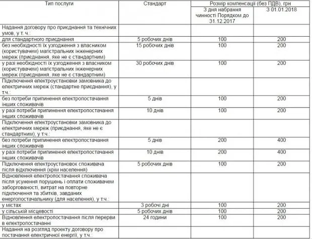 У січні 2017 року набув чинності Порядок забезпечення стандартів якості послуг з електропостачання, затверджений постановою НКРЕКП від 18 жовтня 2016 року. Саме цим документом і передбачено, що споживачі матимуть право вимагати від енергокомпаній компенсації за неякісні послуги.