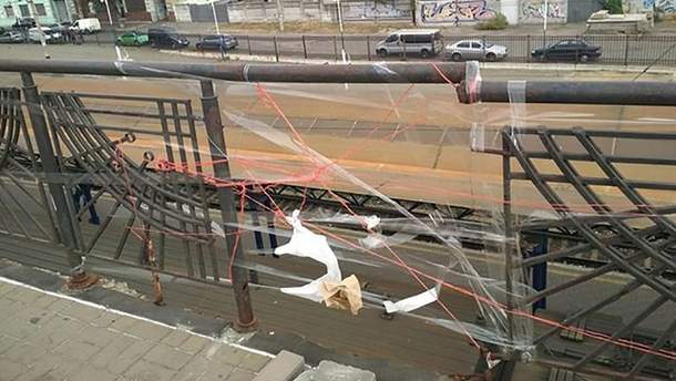 Комунальники Києва спробували "відремонтувати" металеву огорожу мосту біля Привокзальної площі за допомогою скотча і ниток.