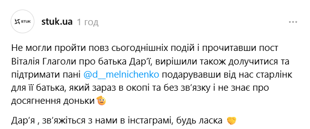 Компанія stuk.ua подарувала Starlink батьку Дарії Мельниченко / Скриншот з мережі
