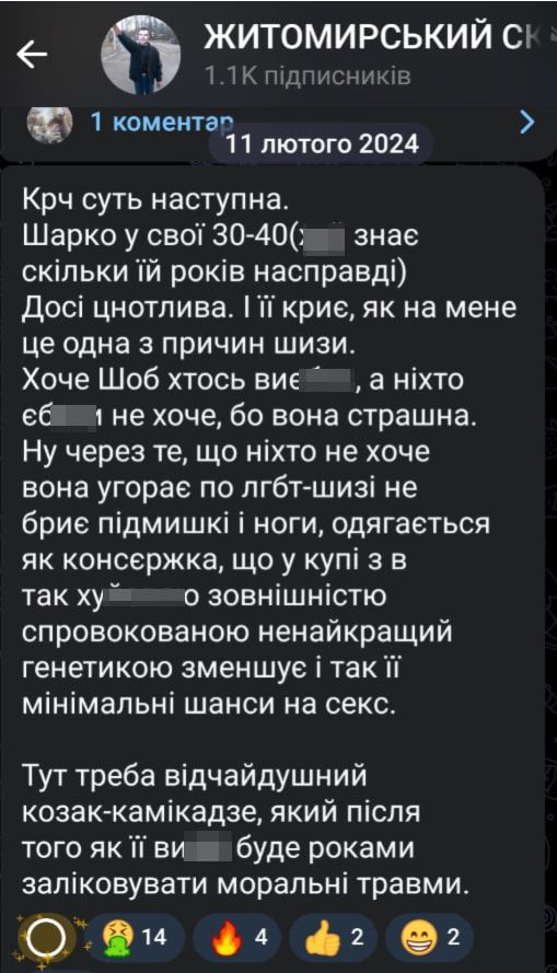 Активістка руху за права жінок Ольга Шарко просить допомогти – її переслідує вже кілька років автор телеграм-каналу "Житомирський скінхед", нині речник штурмових військ Олексій Свинаренко. Він публічно обіцяє заплатити гроші тим, хто її зґвалтує чи обіллє кислотою, "як корову Гандзюк". Ольга написала вже десятки заяв у поліцію і в Міноборони – але відмова, бо "відсутній склад злочину". Ми можемо допомогти Ользі хоча б розголосом?