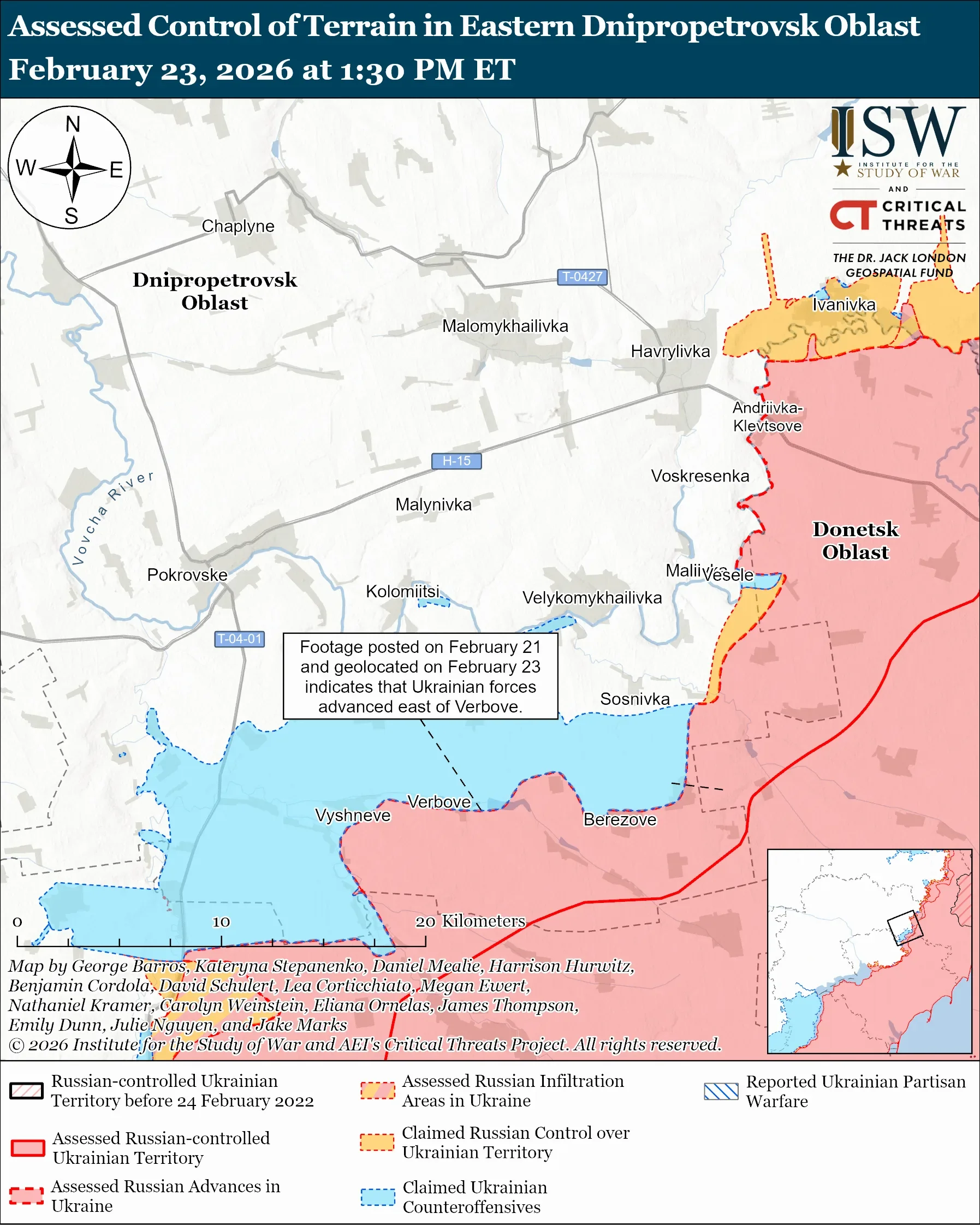Геолокаційні відео, оприлюднені 21 лютого, свідчать про просування українських сил на схід від Вербового. Водночас ISW не виявив доказів контролю російських військ над Тернуватим, попри відповідні заяви з боку окупантів.