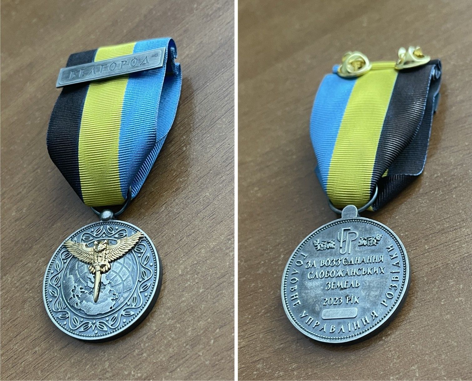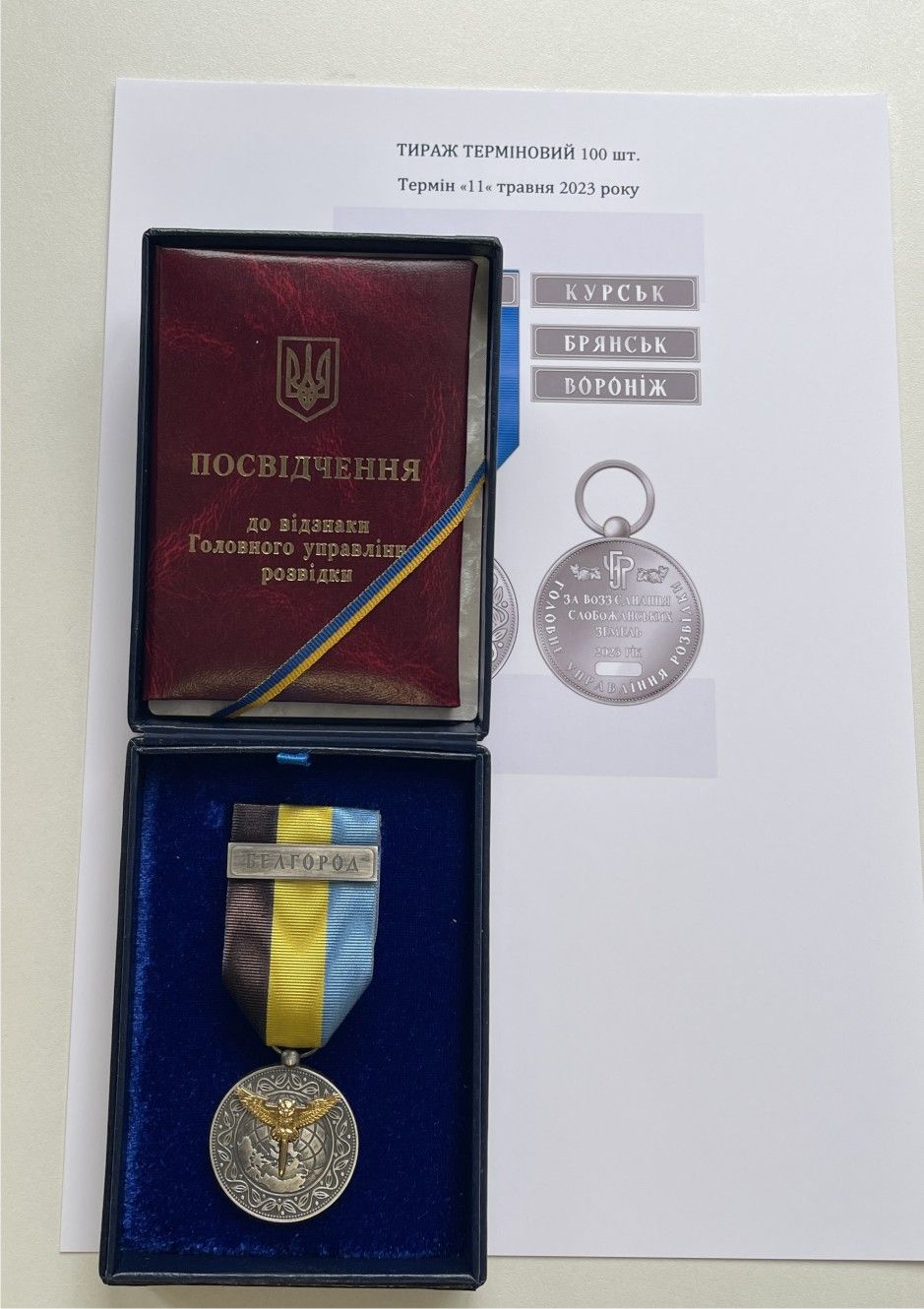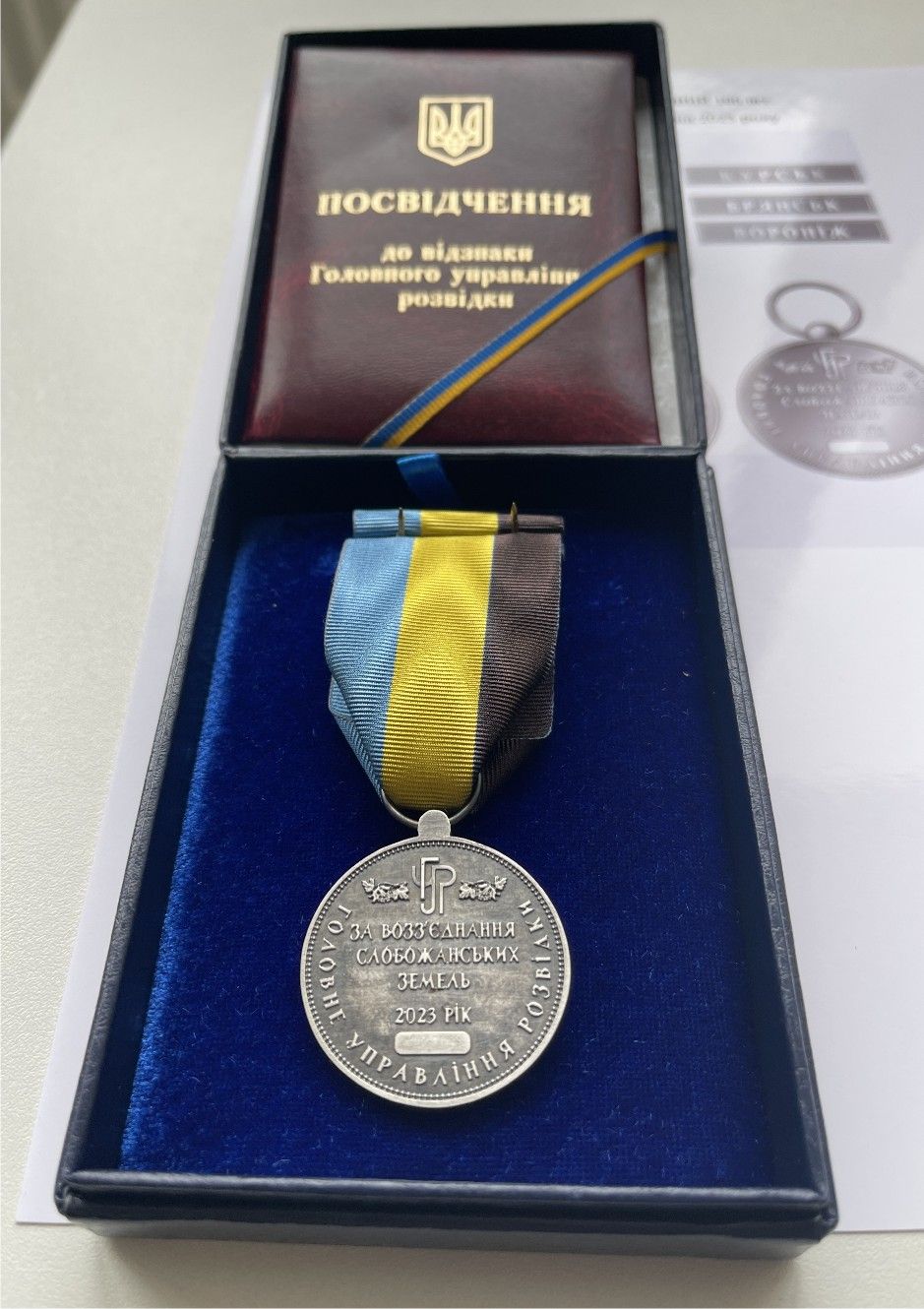 Власне, на медалях красується надпис "За возз'єднання Слобожанських земель" та "Бєлгород", а також є емблема Головного управління розвідки України.