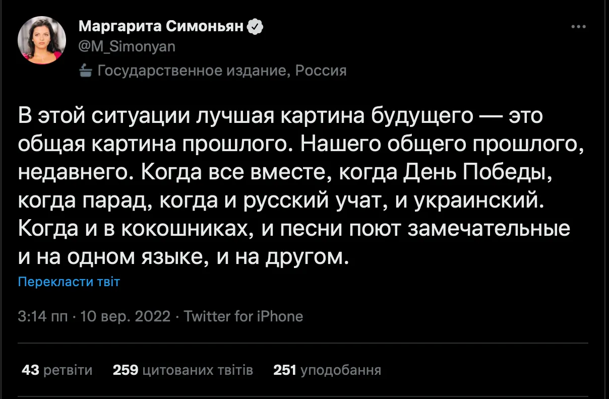 Сімоньян вирішила озвучити, яким бачить майбутнє України та росії. Мовляв, найкраще для наших країн, – залишатися у спільному минулому.