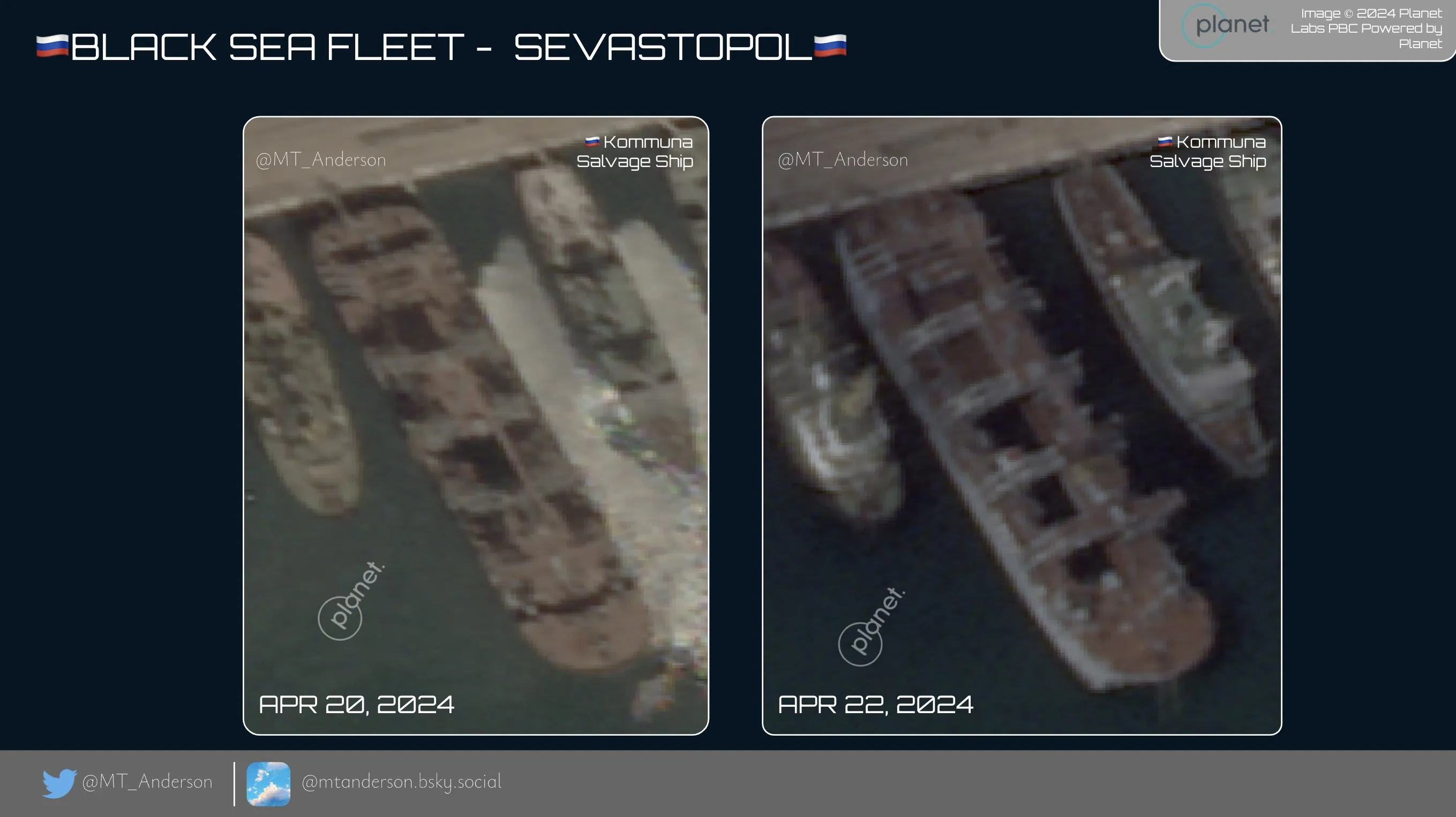 Судячи з супутникових знімків, "Коммуна" все ж не зазнала значних ушкоджень. Для порівняння OSINT-аналітик опублікував дві фотографії – 20 (до атаки) та 22 (після атаки) квітня. Наразі судно перебуває на тому ж місці, де по ньому завдали удару.