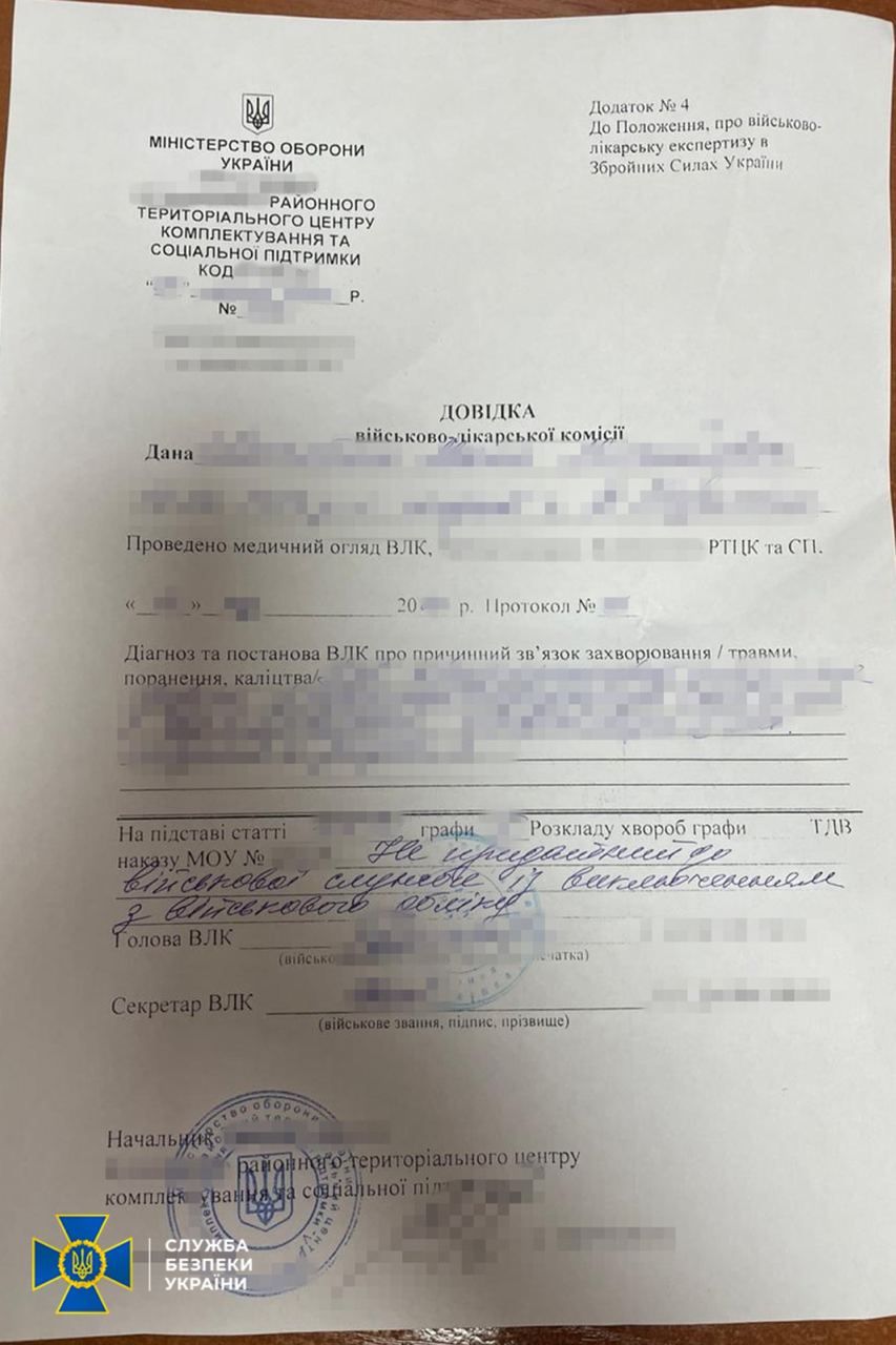 Голова ВЛК продавала ухилянтам підроблені довідки про непридатність до служби в лавах ЗСУ з відповідним виключенням з військового обліку. Підозрювана ставила на всіх таких паперах свій підпис та завіряла їх печаткою. Вона навіть не вимагала від клієнтів проходити військово-лікарську комісію.