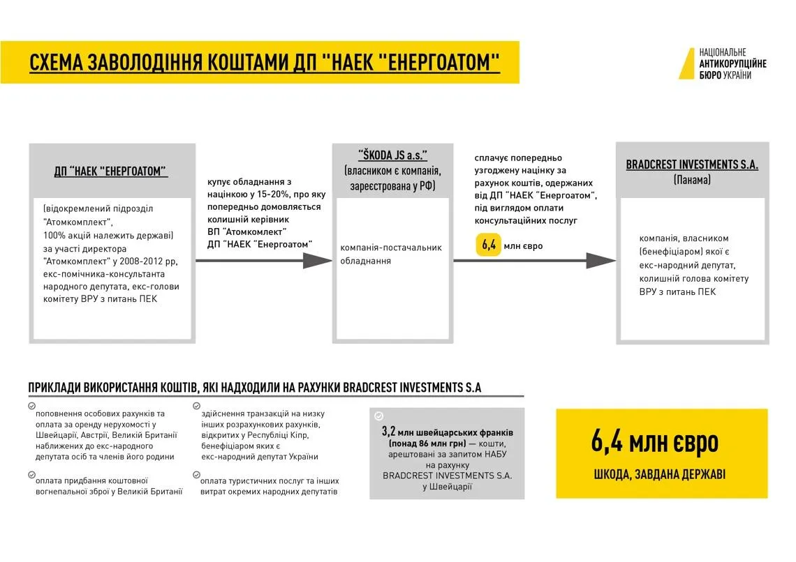 Один із підозрюваних, колишній керівник відокремленого структурного підрозділу ДП "НАЕК "Енергоатом", який представляв "Bradcrest Investment S.A", домовлявся з представниками "Škoda JS" про розміри оплати "консультаційних послуг" та укладав необхідні для цього документи.Кошти з рахунків "Škoda JS" після отримання їх від ДП "НАЕК "Енергоатом" у визначених попередньо сумах скеровувались на рахунки "Bradcrest Investment S.A", відкриттям яких у банках Швейцарії опікувався другий представник цієї компанії.