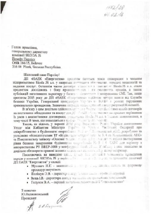 Також Ю.Недашковський намагався впливати на керівників "SKODA JS a.s." для отримання таких документів, які потім можна було долучити до справи М.Мартиненка. Так у своєму листі на Голову правління, генерального директора компанії "SKODA JS a.s." Йозефа Перліка від 5 лютого 2016 року він просить здійснити спільний аналіз договорів на постачання обладнання та послуг для ДП "НАЕК "Енергоатом", які розслідують правоохоронні органи, та надати висновок, що ціни в цих договорах не відрізняються від аналогічних цін на обладнання та послуги для інших іноземних країн.