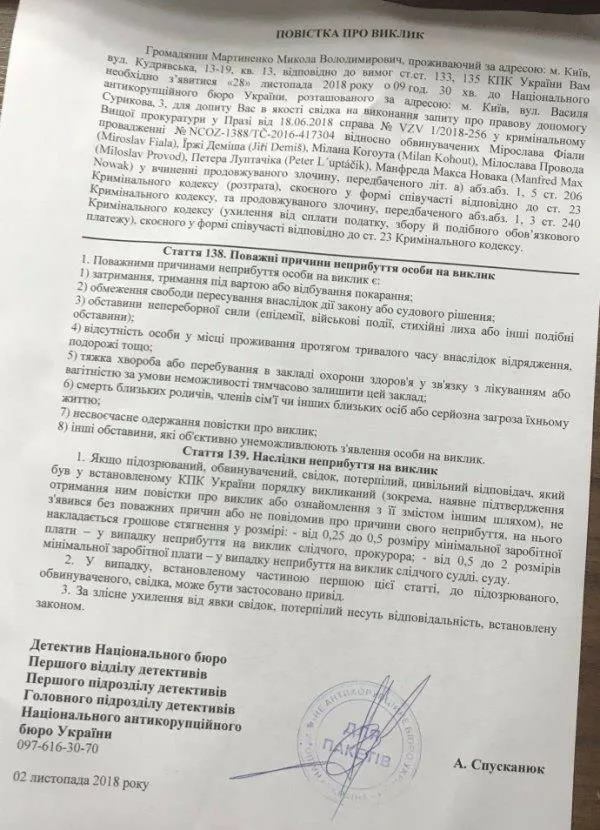 Свідченням цього є подальше розслідування НАБУ за запитом прокуратури Праги. В запиті чеської прокуратури від 18.06.2018 року про правову допомогу щодо виклику М.Мартиненка на допит в якості свідка йдеться про Мирослава Фіали, Їржі Деміша, Мілана Когута, Мілослава Провода, Петера Лупатчіка, Манфреда Макса Новака, які обвинувачуються чеською стороною у вчиненні продовжуваного злочину.