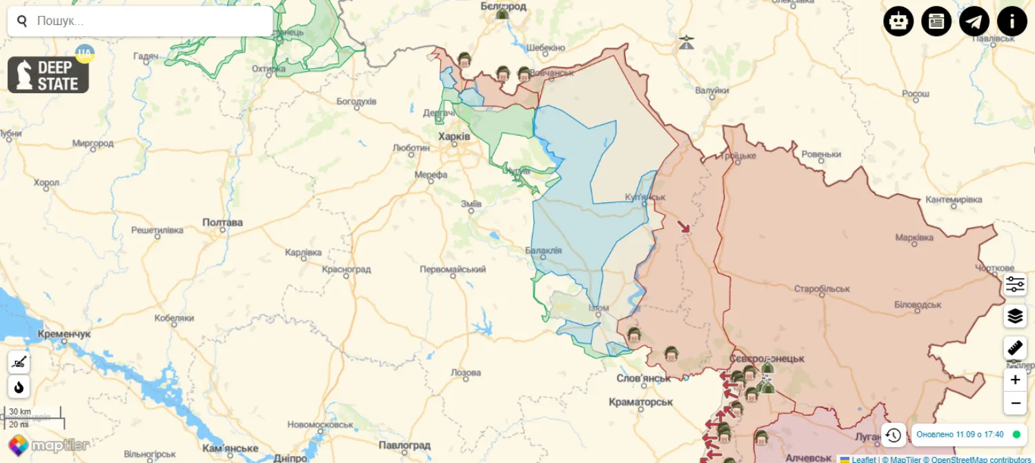 Пояснюємо на інтерактивній онлайн мапі бойових дій, які населені пункти вдалось звільнити нашим військовим станом на 20:30 11 вересня.