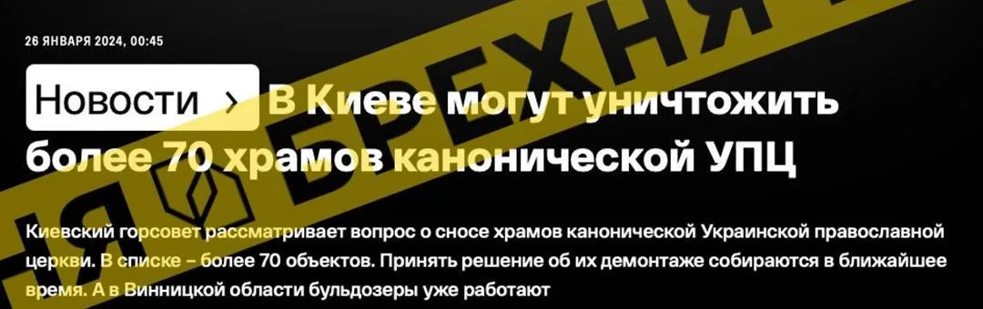 Які ж меседжі Москва намагається пропхати у голови українців? Перший традиційний блок – це фейки про "катастрофічні" втрати ЗСУ, можливу окупацію московитами нових територій України ("наступ" на Суми, Харків, Запоріжжя тощо). Такі повідомлення мають на меті поширювати в суспільстві "всепропальські" та пораженські настрої, паніку та песимізм. Інший напрямок ІПСО – розпалювання ворожнечі всередині України, зокрема на релігійному ґрунті. Тут окупанти також активізувалися за останні місяці. Зокрема, наприкінці січня кремлівські ЗМІ поширювали фейк про те, що в Києві нібито готують до знесення 70 храмів "канонічєской УПЦ" (ідеться про УПЦ Московського патріархату – філіал РПЦ в Україні).