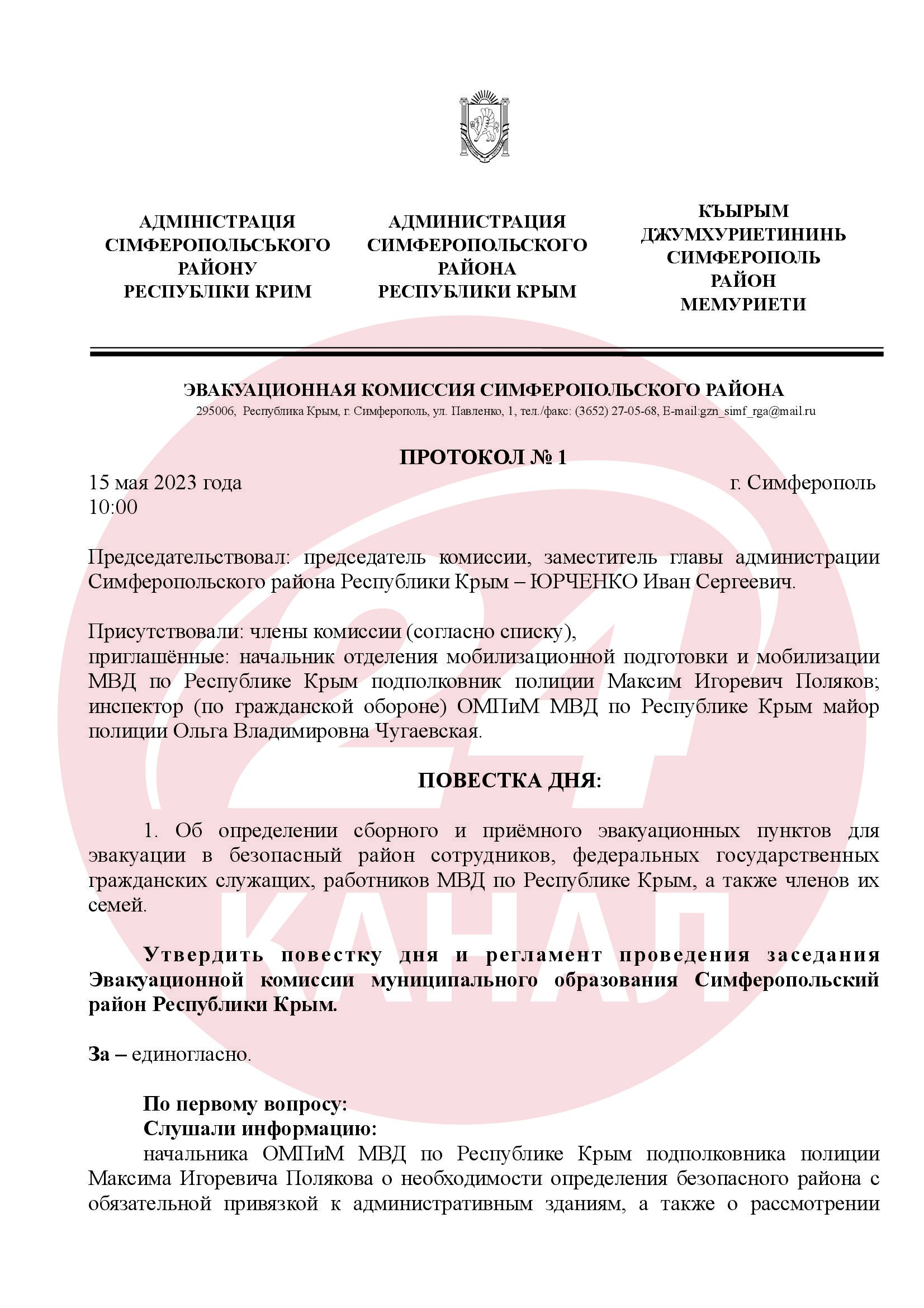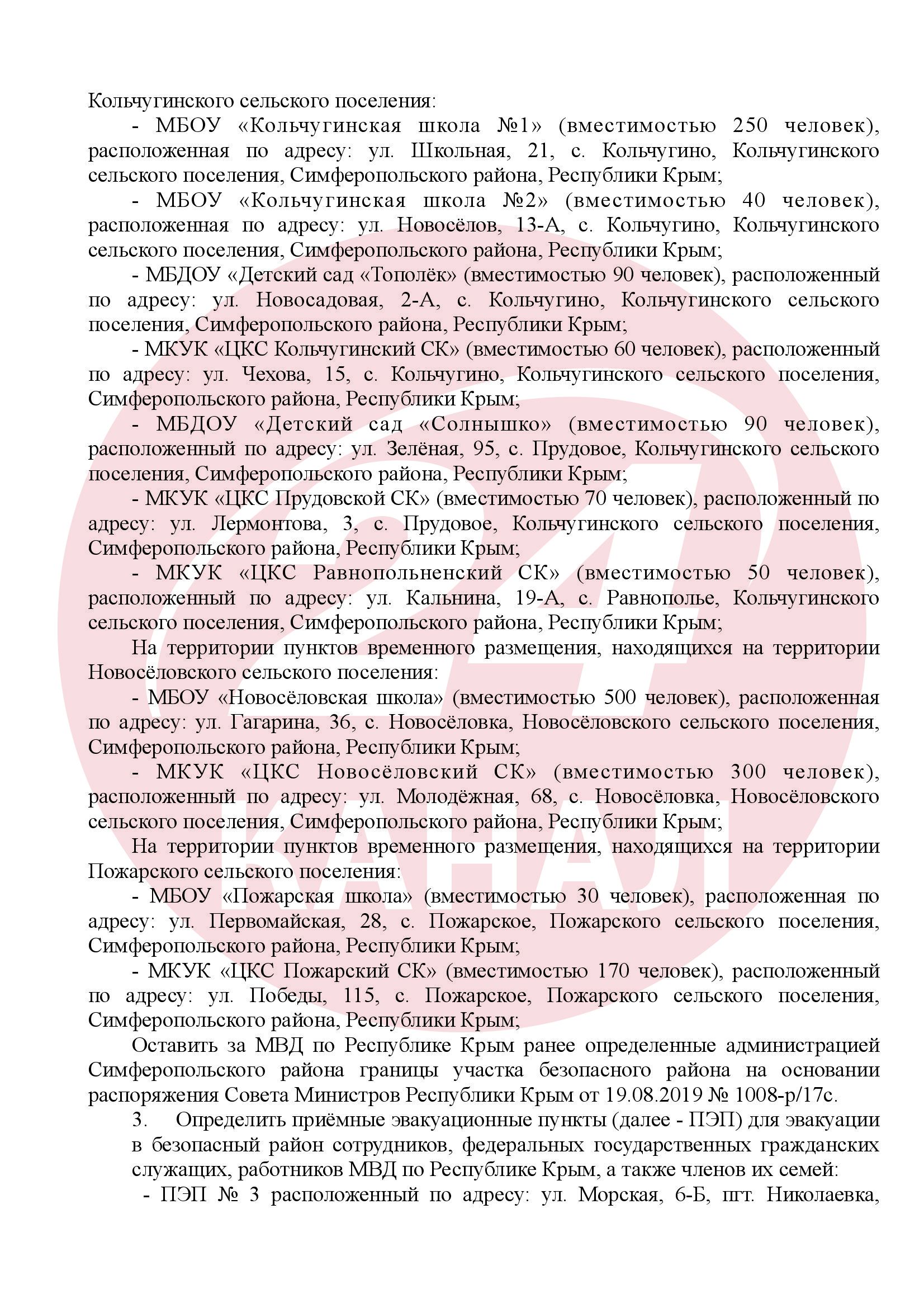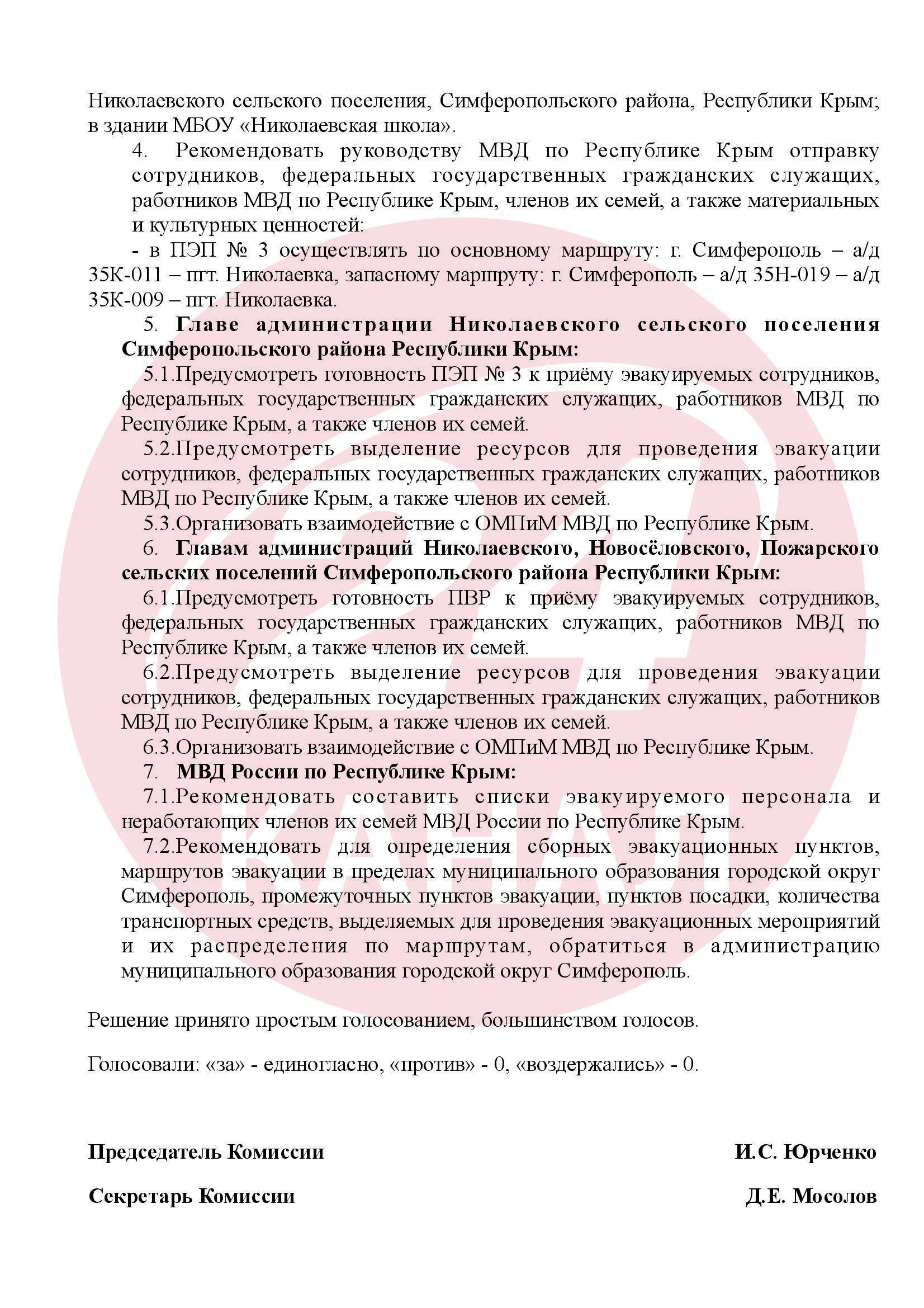 Так, згідно з проєктом протоколу, передбачається евакуація співробітників, федеральних державних цивільних службовців, співробітників МВС у Криму, а також їхніх членів родин. Усіх їх планують розселити по базах відпочинку, пансіонатах і організаціях, пунктах тимчасового розміщення у Сімферопольському районі.