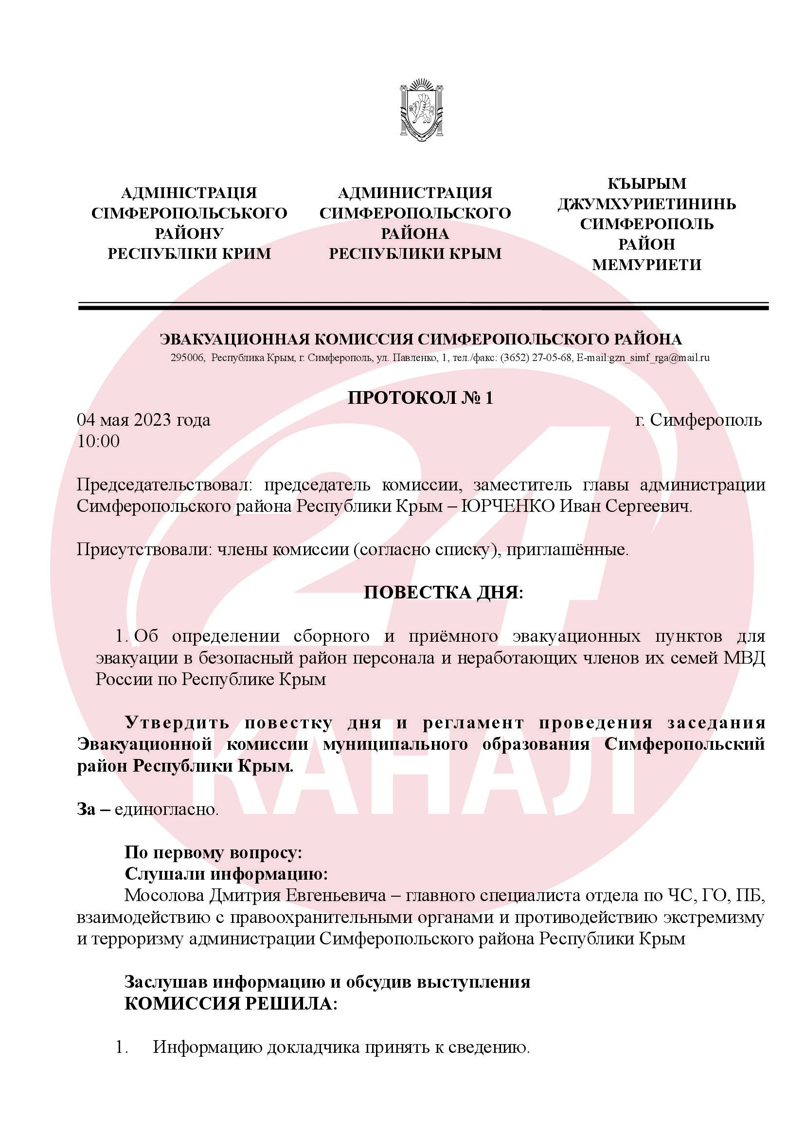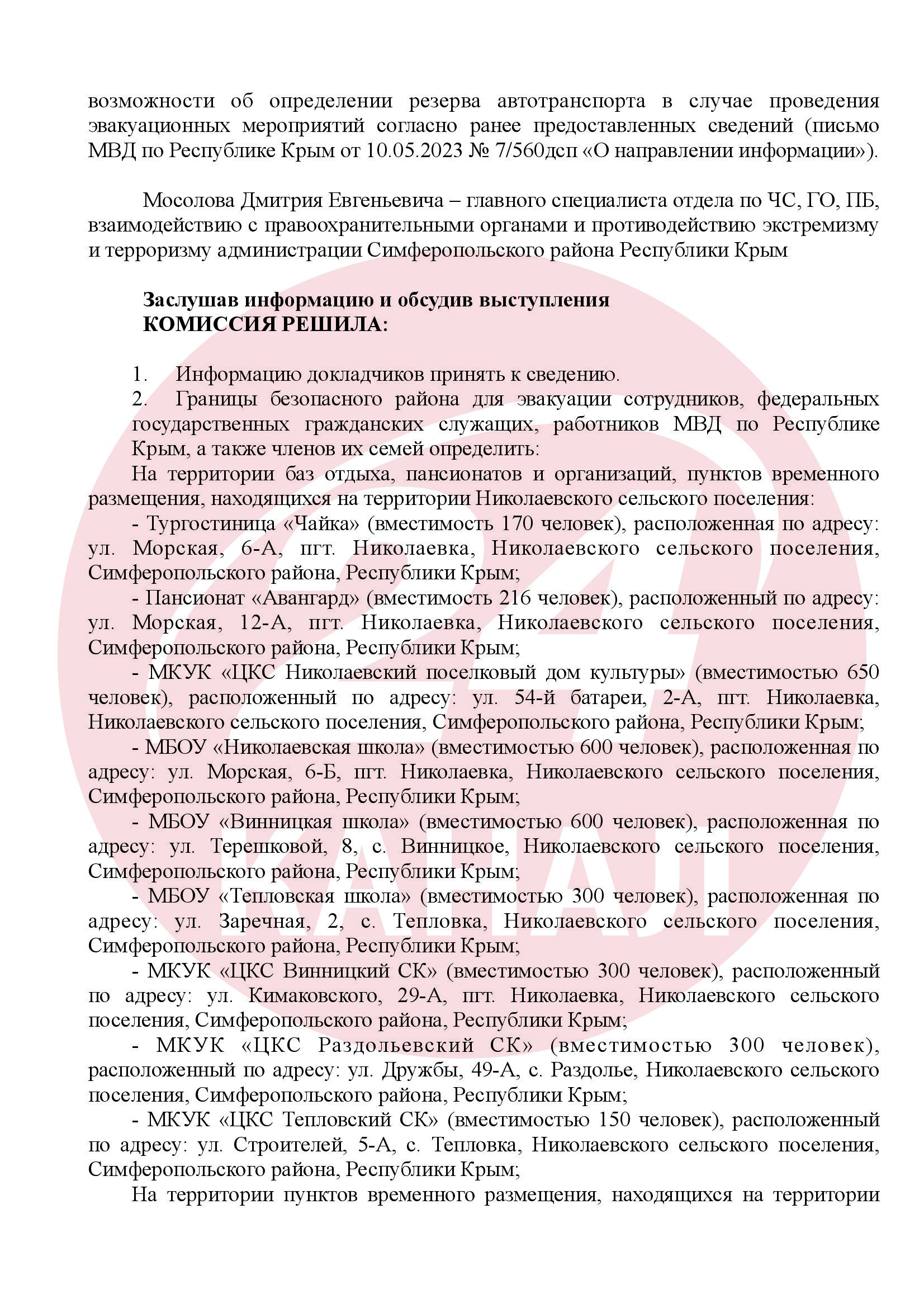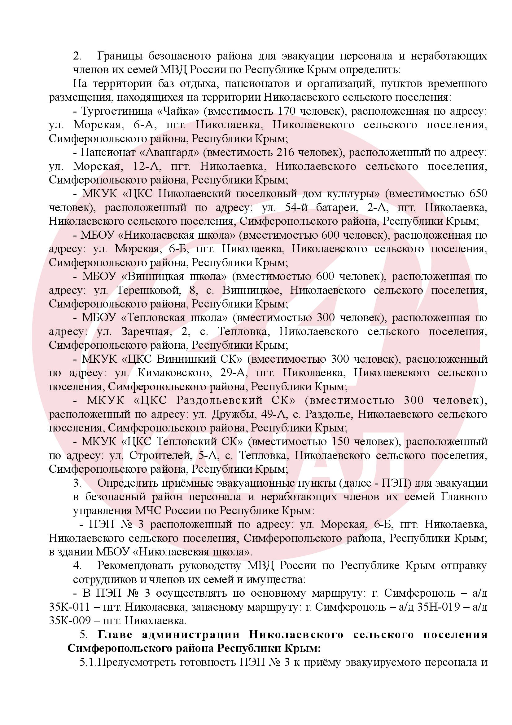 Так, згідно з проєктом протоколу, передбачається евакуація співробітників, федеральних державних цивільних службовців, співробітників МВС у Криму, а також їхніх членів родин. Усіх їх планують розселити по базах відпочинку, пансіонатах і організаціях, пунктах тимчасового розміщення у Сімферопольському районі.