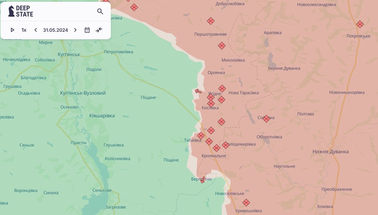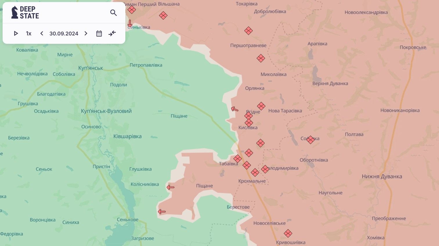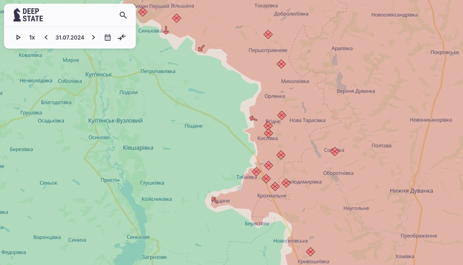Однак якщо дивитися на ситуацію на фронті, то там все дещо інакше. На жаль, абсолютна більшість Луганщини під контролем ворога. Росіяни просуваються на Донеччині й бої тривають під Покровськом. Однак після Покровського і Новопавлівського напрямків, що на Донеччині, зараз найгарячішим є Куп'янський на Харківщині.