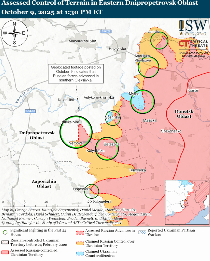 Українські сили утримували позиції або просунулися на Дніпропетровщині. Геолоковані кадри за 9 жовтня, показують як український танк здійснює рейд і, ймовірно, знищує російські позиції в південній частині Олексіївки (південний захід від Великомихайлівки), що свідчить: ЗСУ утримують позиції або просунулися в цьому районі, який російські джерела раніше вважали під своїм контролем. Інститут вивчення війни вважає, що росіяни більше не контролюють південну Олексіївку.