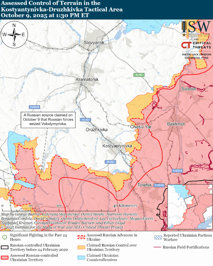 - Представник української бригади, що діє на Торецькому напрямку (південний схід від Костянтинівки), 9 жовтня повідомив, що російські сили зосереджуються на проникненні малими групами, а окремі російські військові навіть заходять до Костянтинівки.