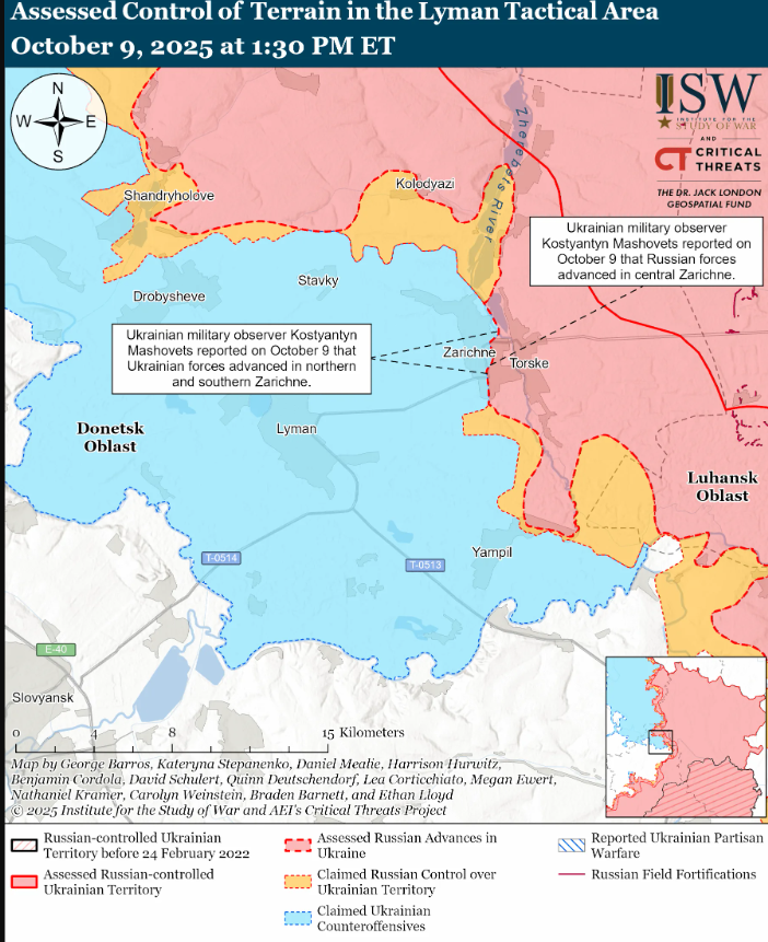 - Оцінюючи ситуацію на Лиманському напрямку, Костянтин Машовець повідомив, що українські сили здійснюють контратаки на південь від Карпівки та, ймовірно, успішно контратакували поблизу Ямполя останніми днями. Він також зазначив, що загарбники проникли до північної частини Зарічного в кількох точках. За його оцінкою, мета росіян – перерізати українську логістику на перетині річки Сіверський Донець із Нетриусом поблизу Новоселівки та Дерилового, а також із Жеребцем – поблизу Ямполя й Дронівки (на схід від Ямполя).